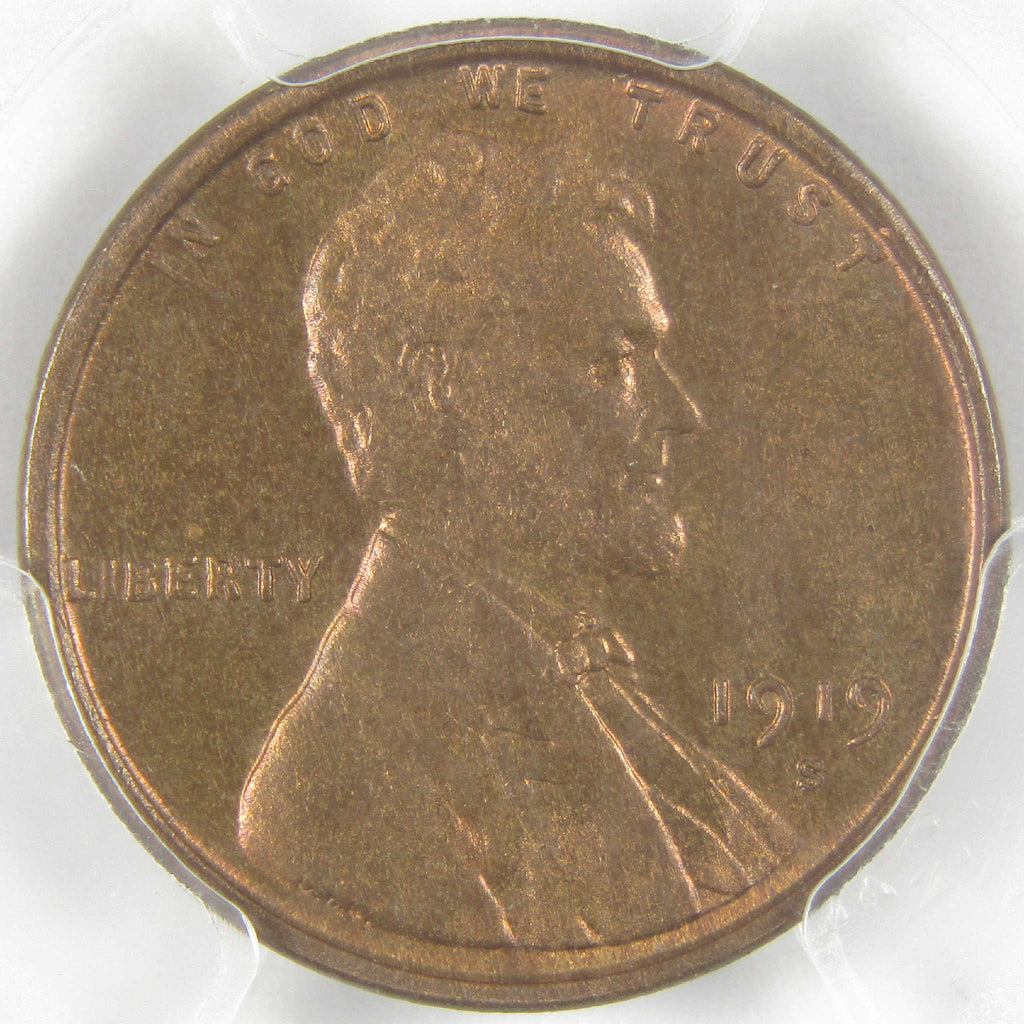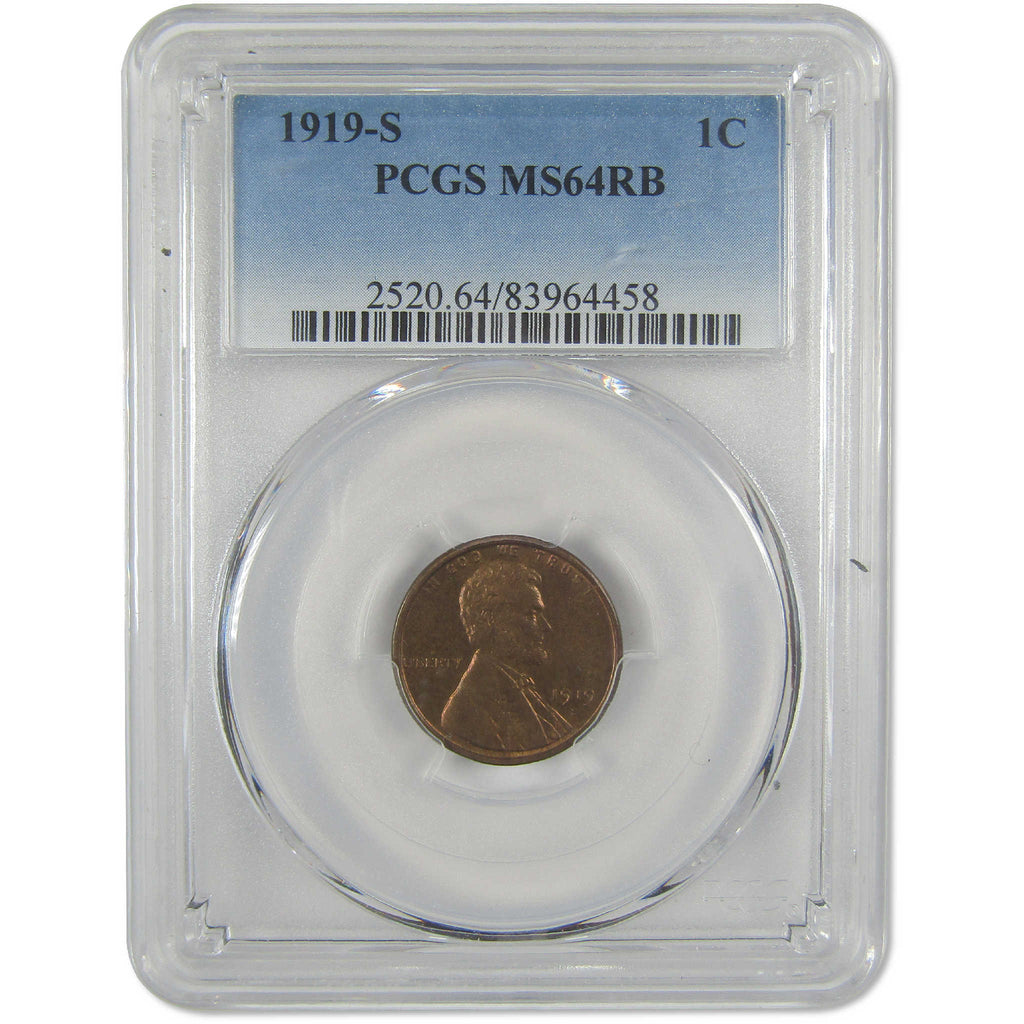A genuine 1919 S Lincoln Wheat Cent Penny Coin, graded and certified MS 64 RB by PCGS