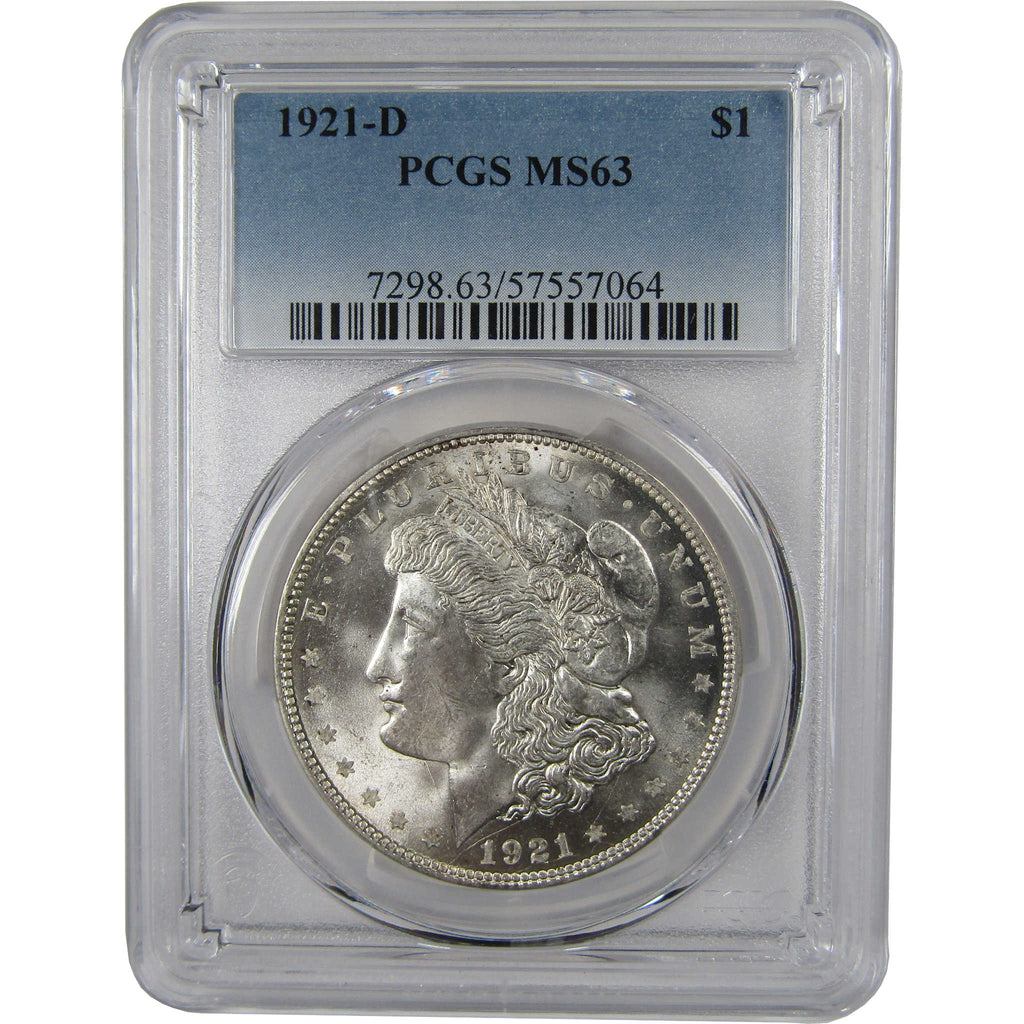A genuine 1921 D Morgan Silver Dollar Coin, graded and certified MS 63 by PCGS. Contains 90% Silver