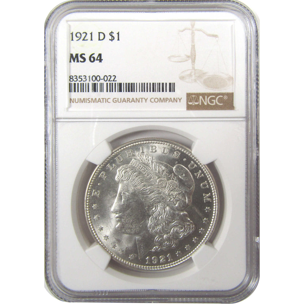 A genuine 1921 D Morgan Silver Dollar Coin, graded and certified MS 64 by NGC. Contains 90% Silver