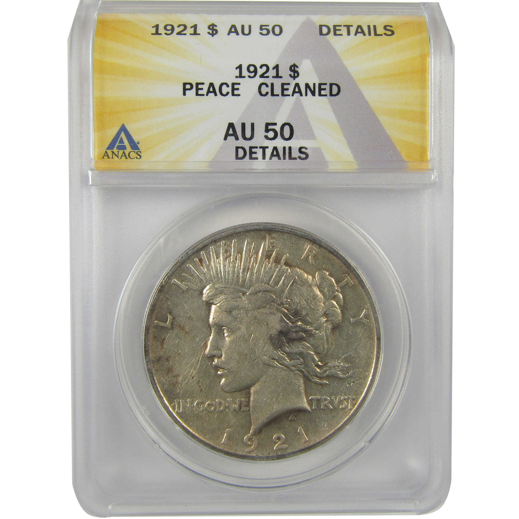 A genuine 1921 High Relief Peace Silver Dollar Coin, graded and certified AU 50 Details by ANACS. Contains 90% Silver. Cleaned