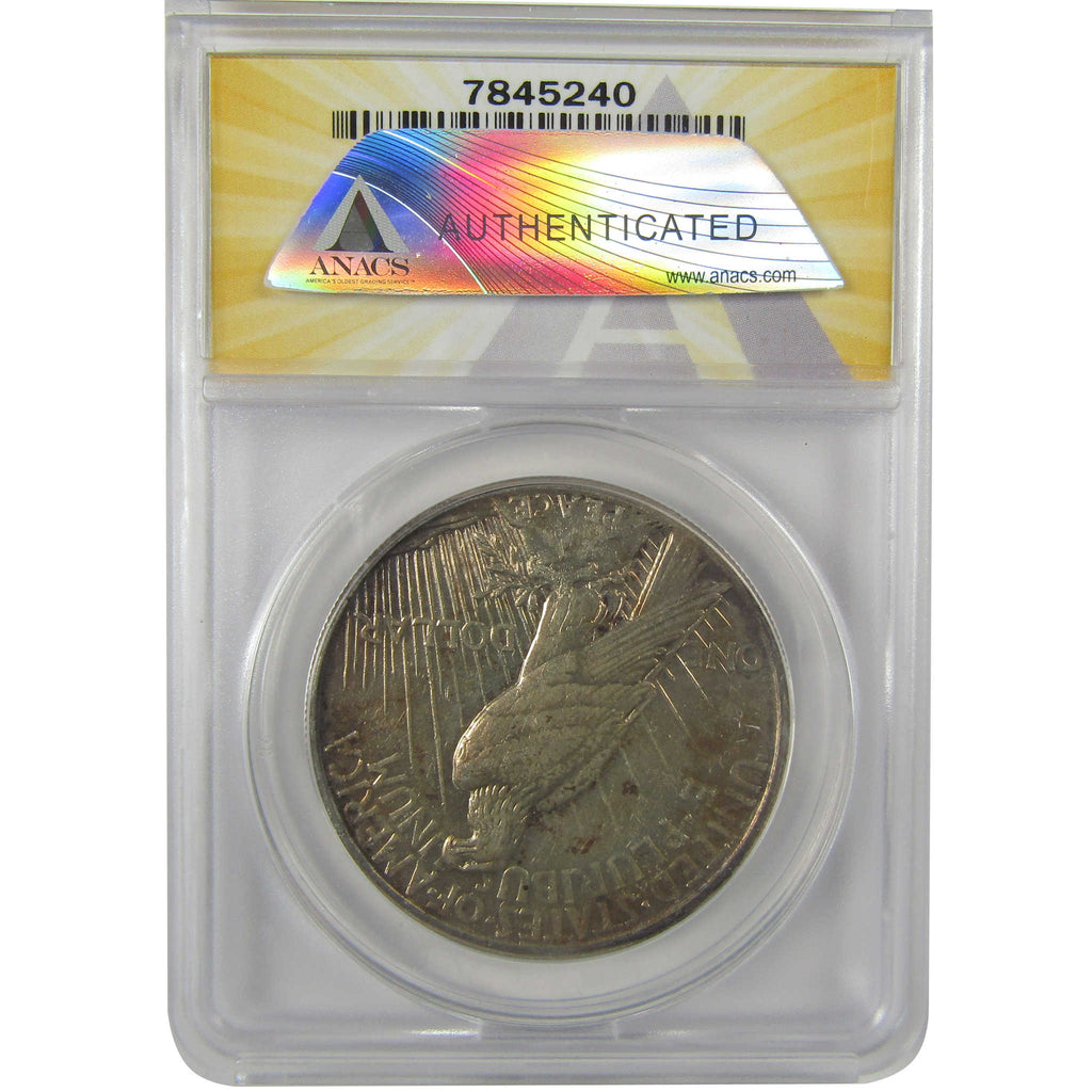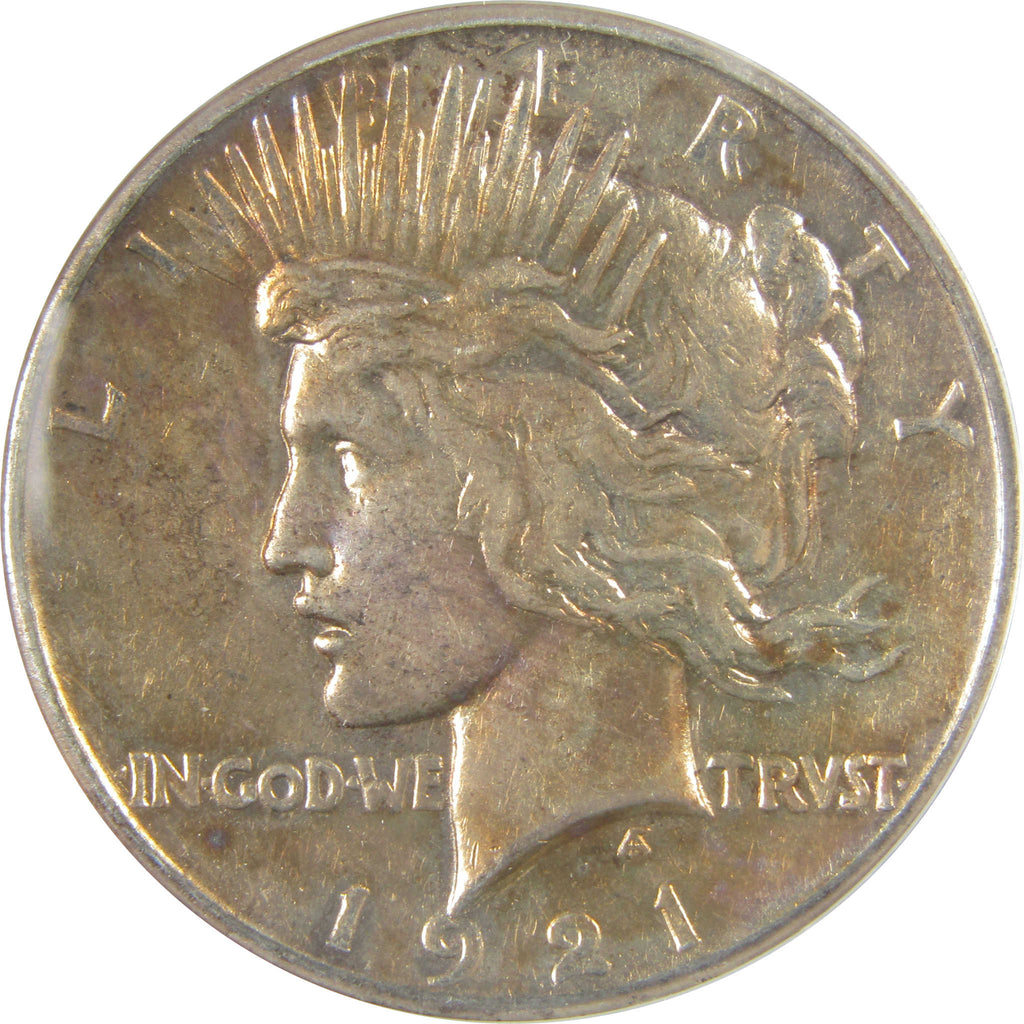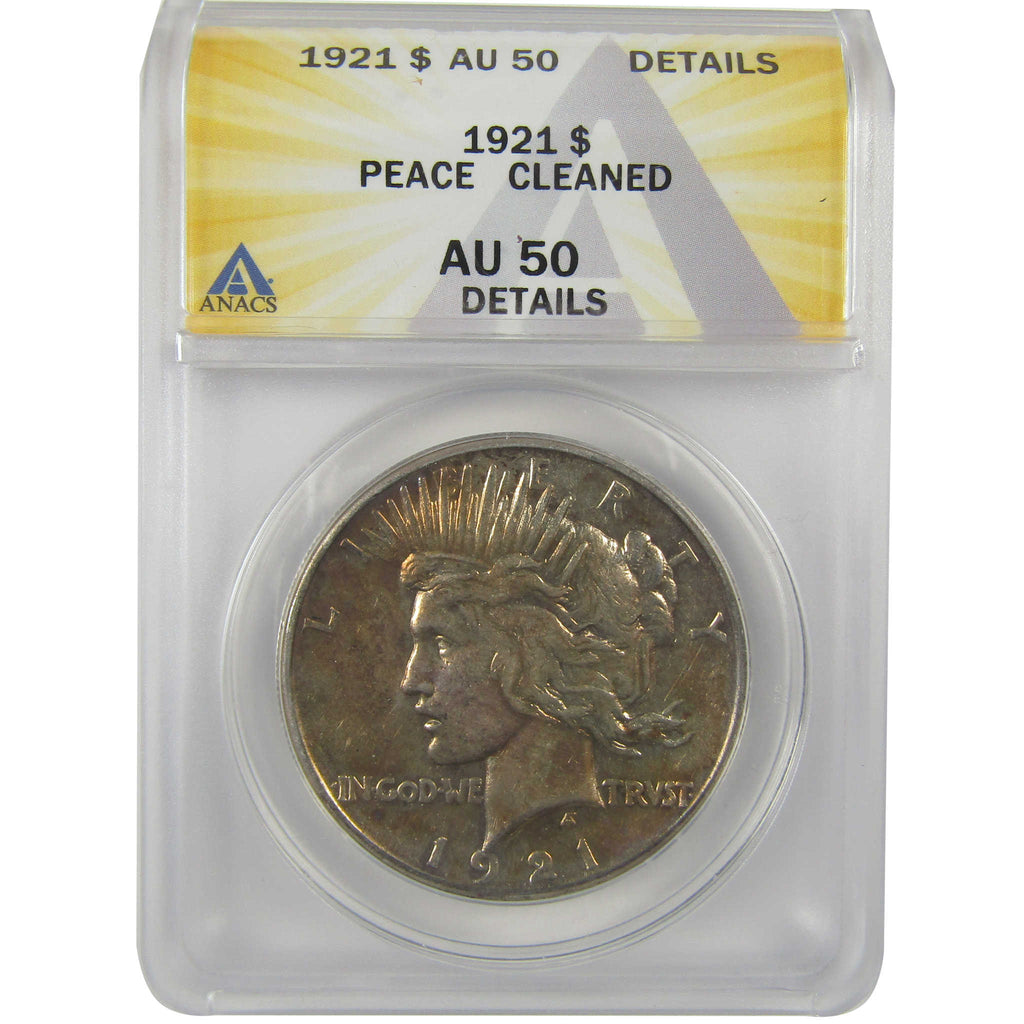 A genuine 1921 High Relief Peace Silver Dollar Coin, graded and certified AU 50 Details by ANACS. Contains 90% Silver. Cleaned