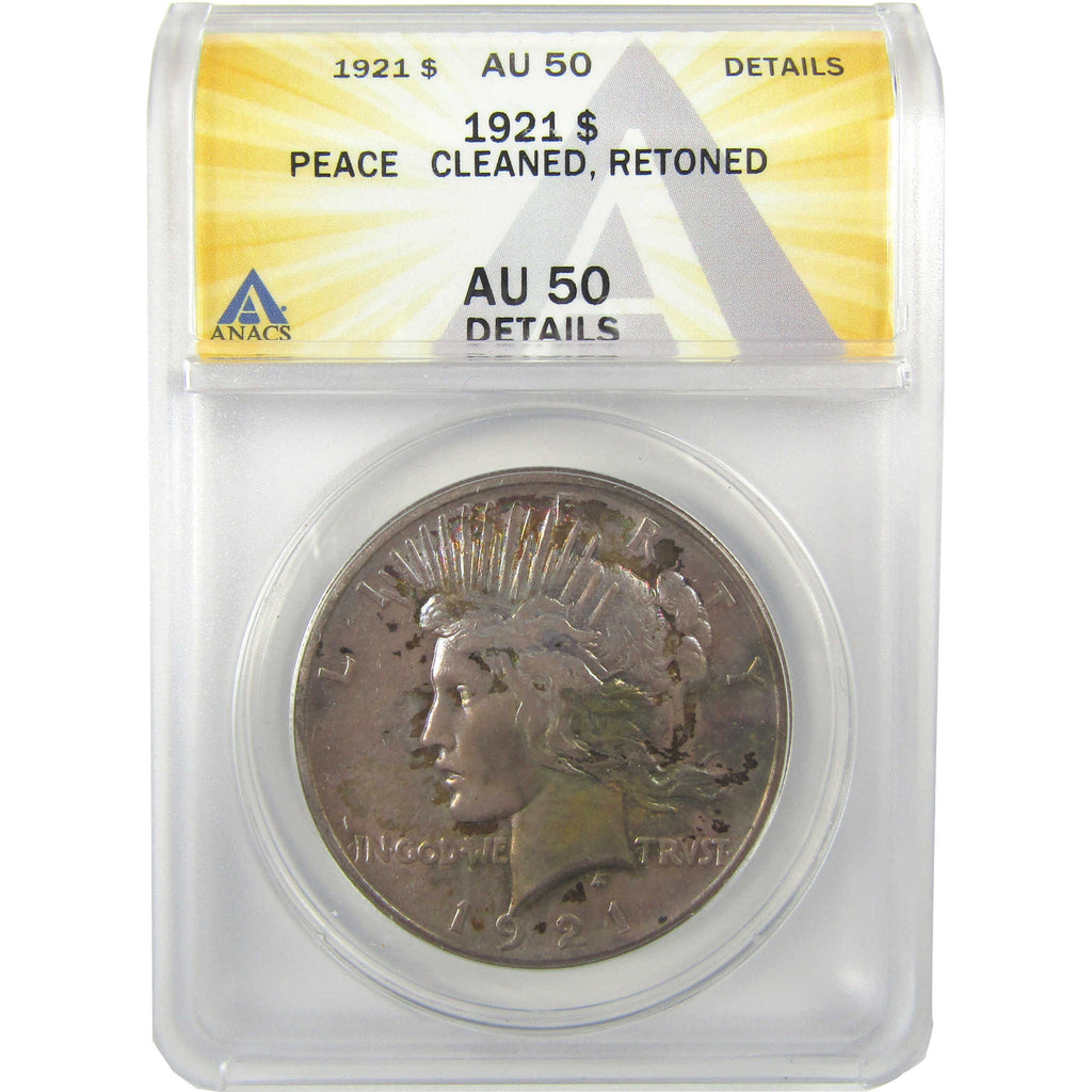 A genuine 1921 High Relief Peace Silver Dollar Coin, graded and certified AU 50 Details by ANACS. Contains 90% Silver. Cleaned, Retoned