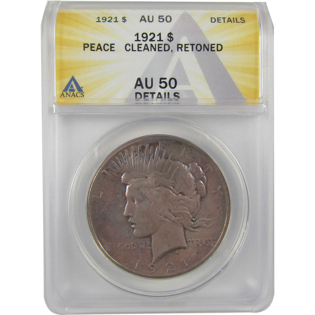 A genuine 1921 High Relief Peace Silver Dollar Coin, graded and certified AU 50 Details by ANACS. Contains 90% Silver. Cleaned, Retoned
