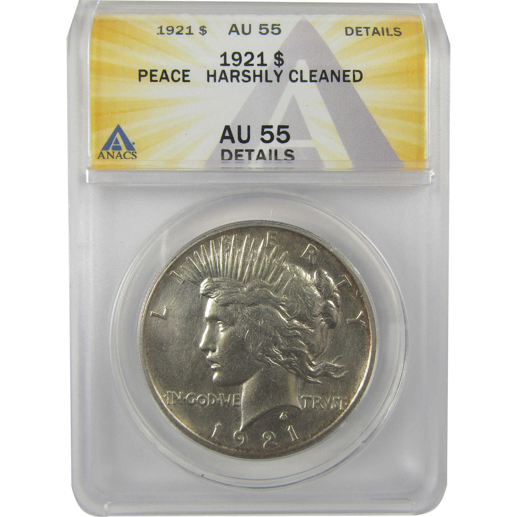 A genuine 1921 High Relief Peace Silver Dollar Coin, graded and certified AU 55 Details by ANACS. Contains 90% Silver. Harshly Cleaned