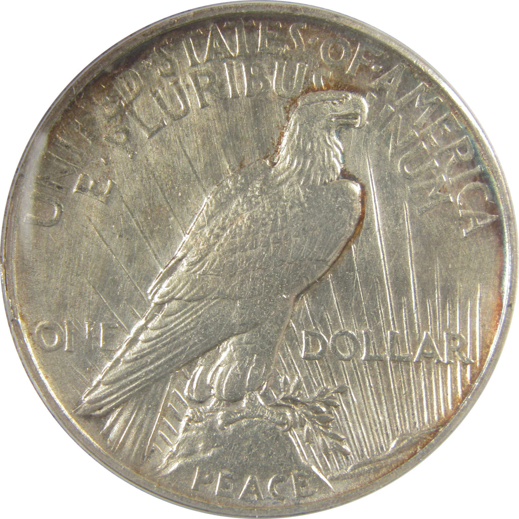 Designed by Anthony de Francisci, this 90% silver Peace depicts a left-facing Liberty wearing a diadem of spikes. The reverse shows an eagle perched on a rock with a laurel branch above the word PEACE, facing the rays of a rising sun.