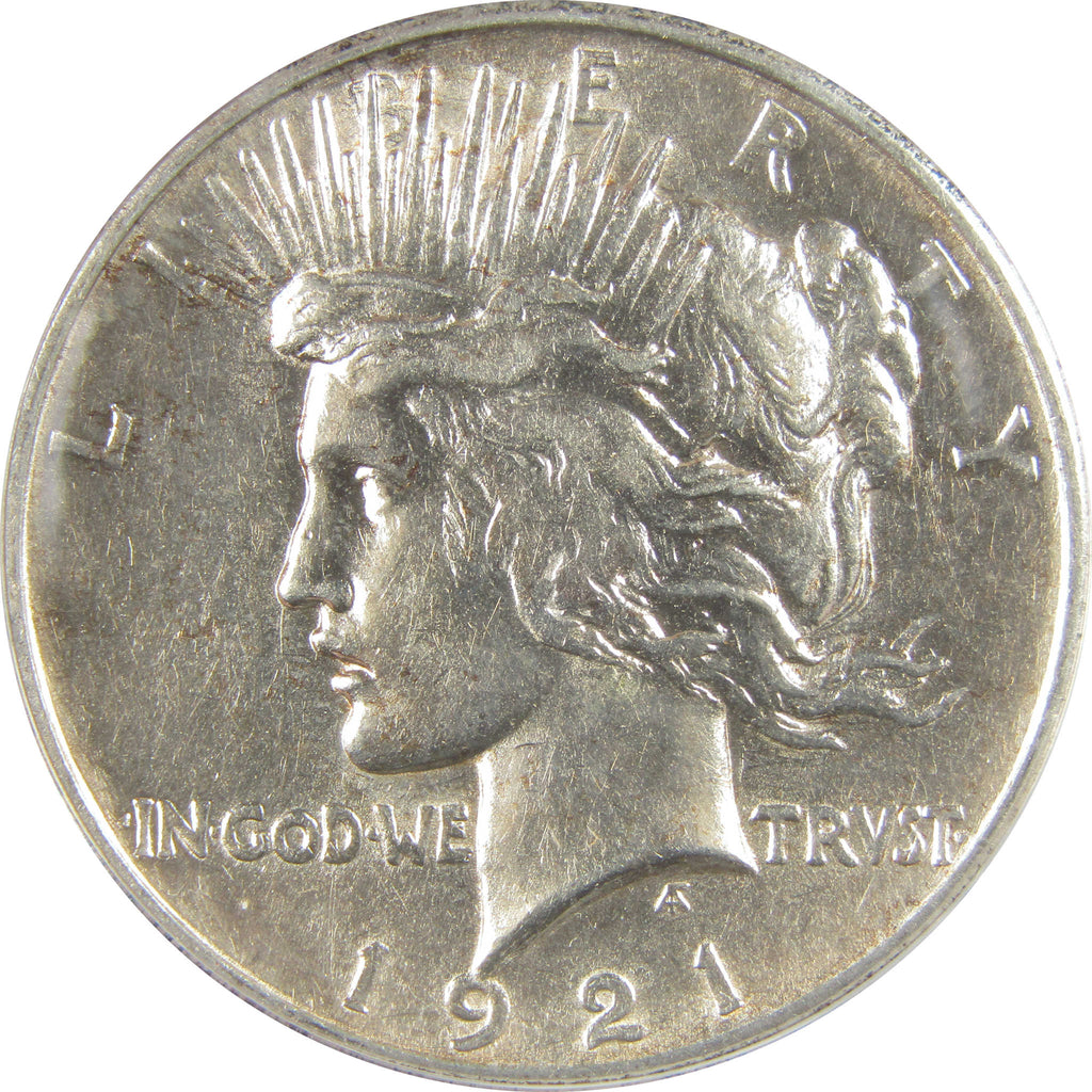 A genuine 1921 High Relief Peace Silver Dollar Coin, graded and certified AU 55 Details by ANACS. Contains 90% Silver. Cleaned