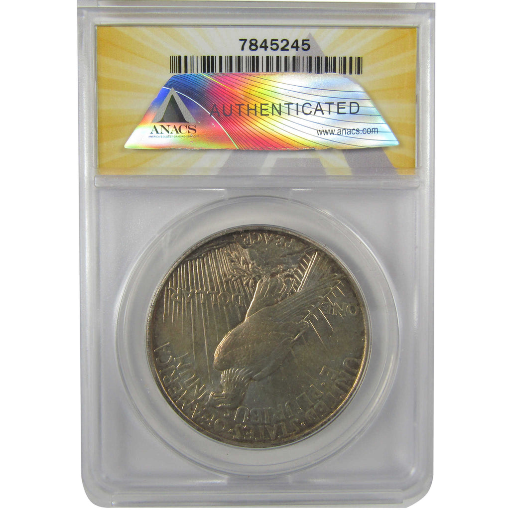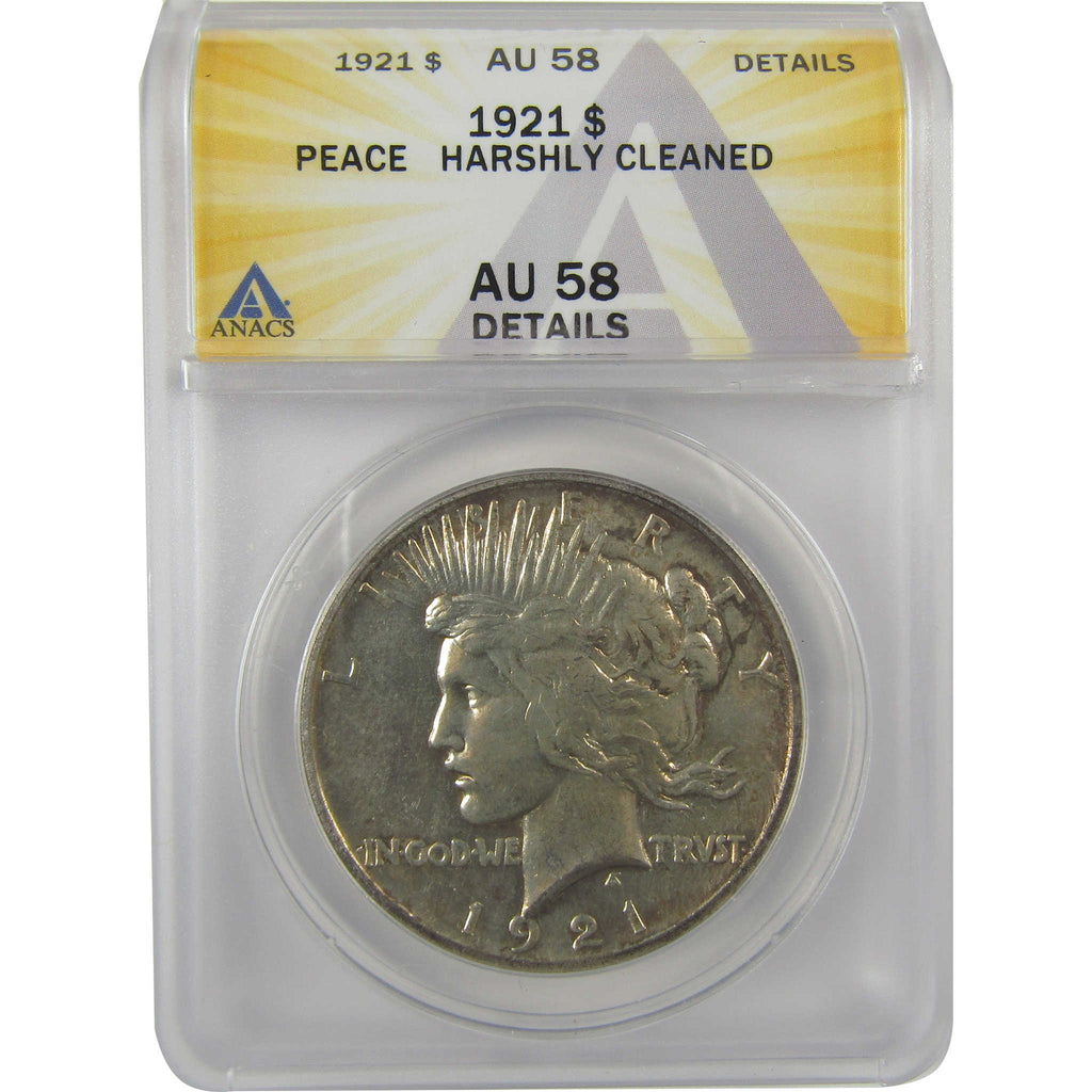 A genuine 1921 High Relief Peace Silver Dollar Coin, graded and certified AU 58 Details by ANACS. Contains 90% Silver. Harshly Cleaned