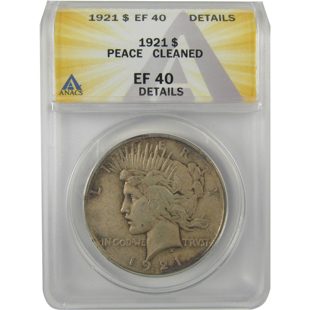 A genuine 1921 High Relief Peace Silver Dollar Coin, graded and certified EF 40 Details by ANACS. Contains 90% Silver. Cleaned