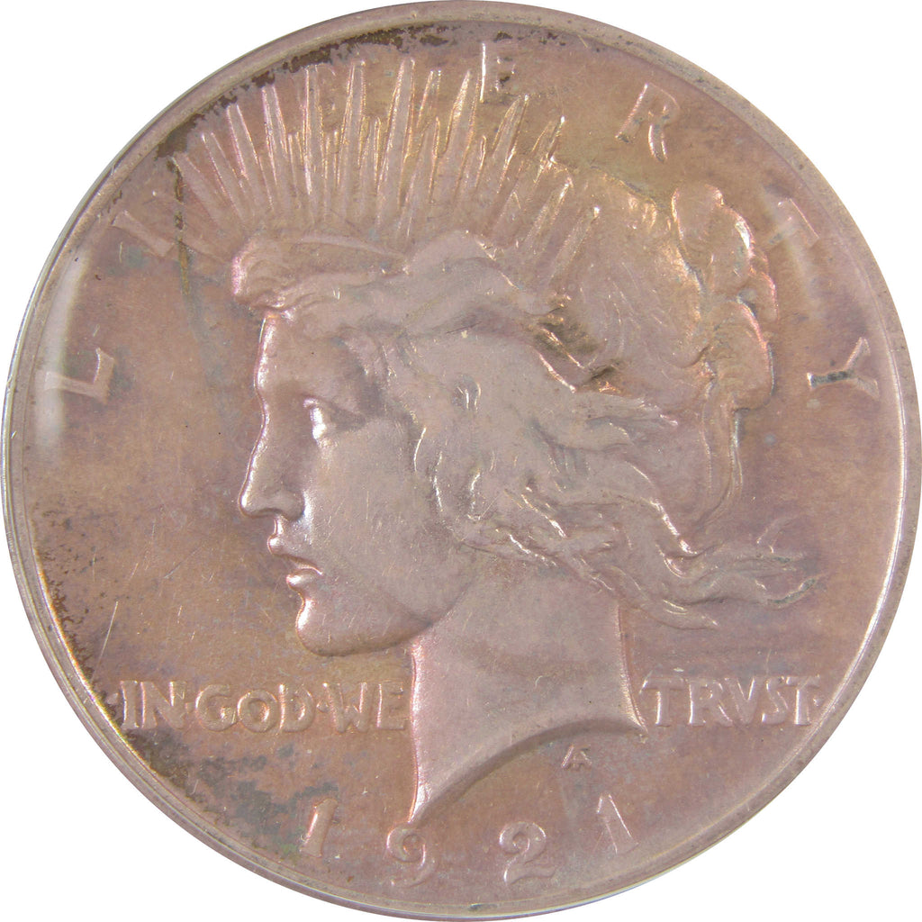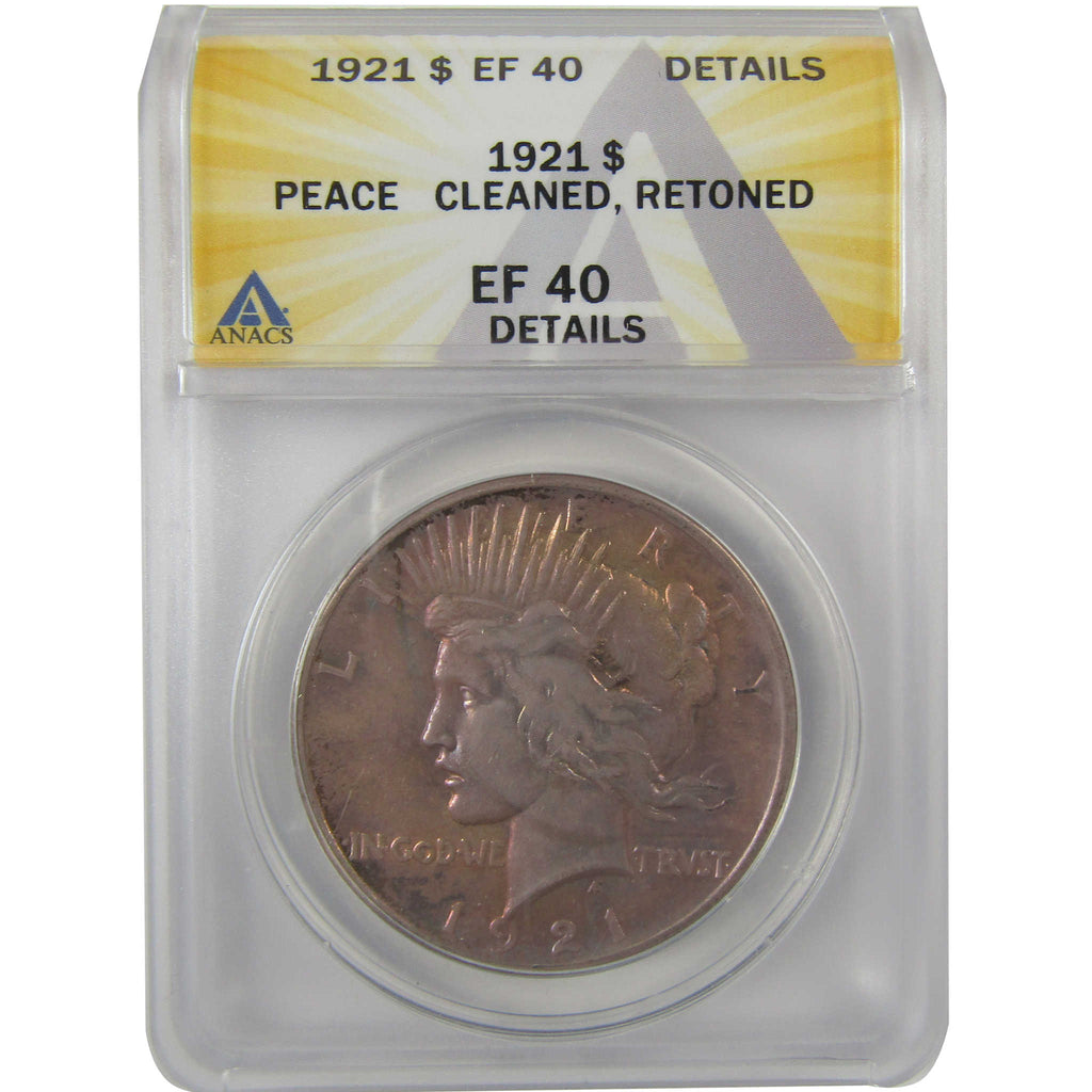 A genuine 1921 High Relief Peace Silver Dollar Coin, graded and certified EF 40 Details by ANACS. Contains 90% Silver. Cleaned, Retoned