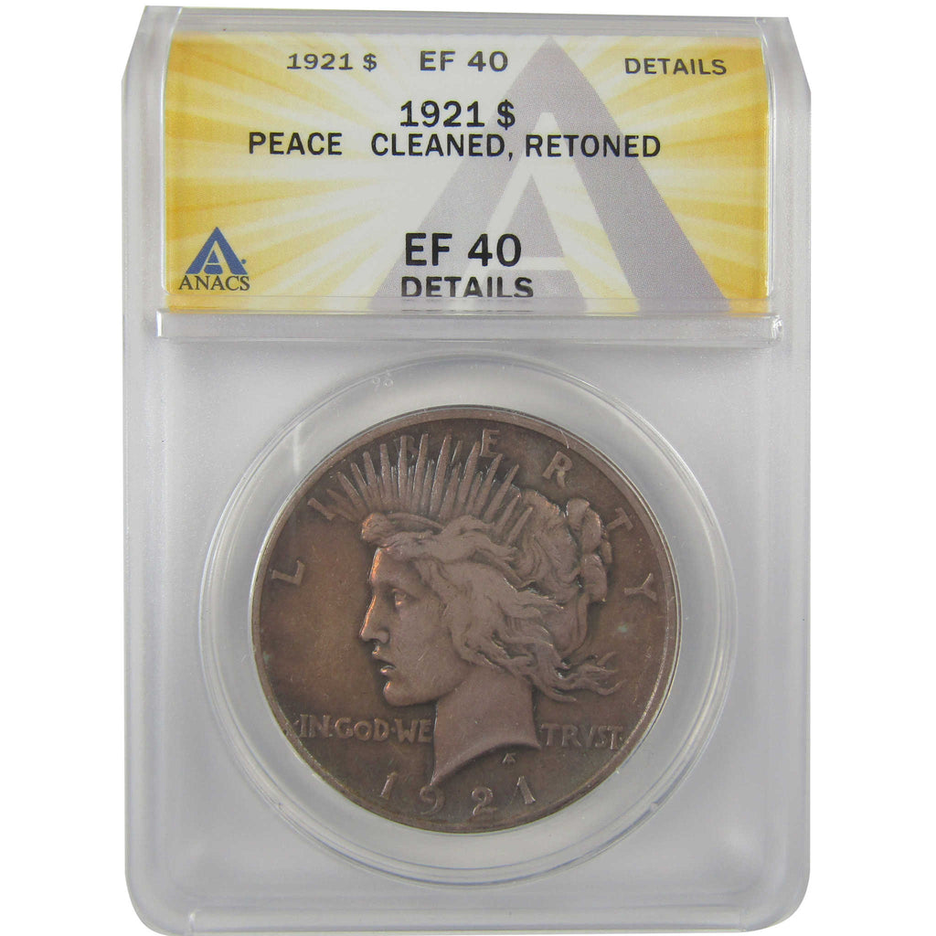A genuine 1921 High Relief Peace Silver Dollar Coin, graded and certified EF 40 Details by ANACS. Contains 90% Silver. Cleaned, Retoned