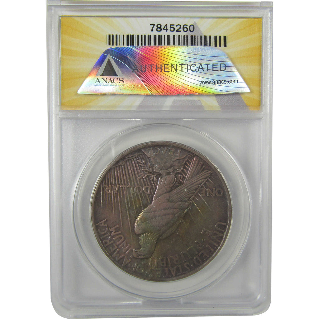 A genuine 1921 High Relief Peace Silver Dollar Coin, graded and certified VF 35 Details by ANACS. Contains 90% Silver. Damaged, Cleaned, Retoned