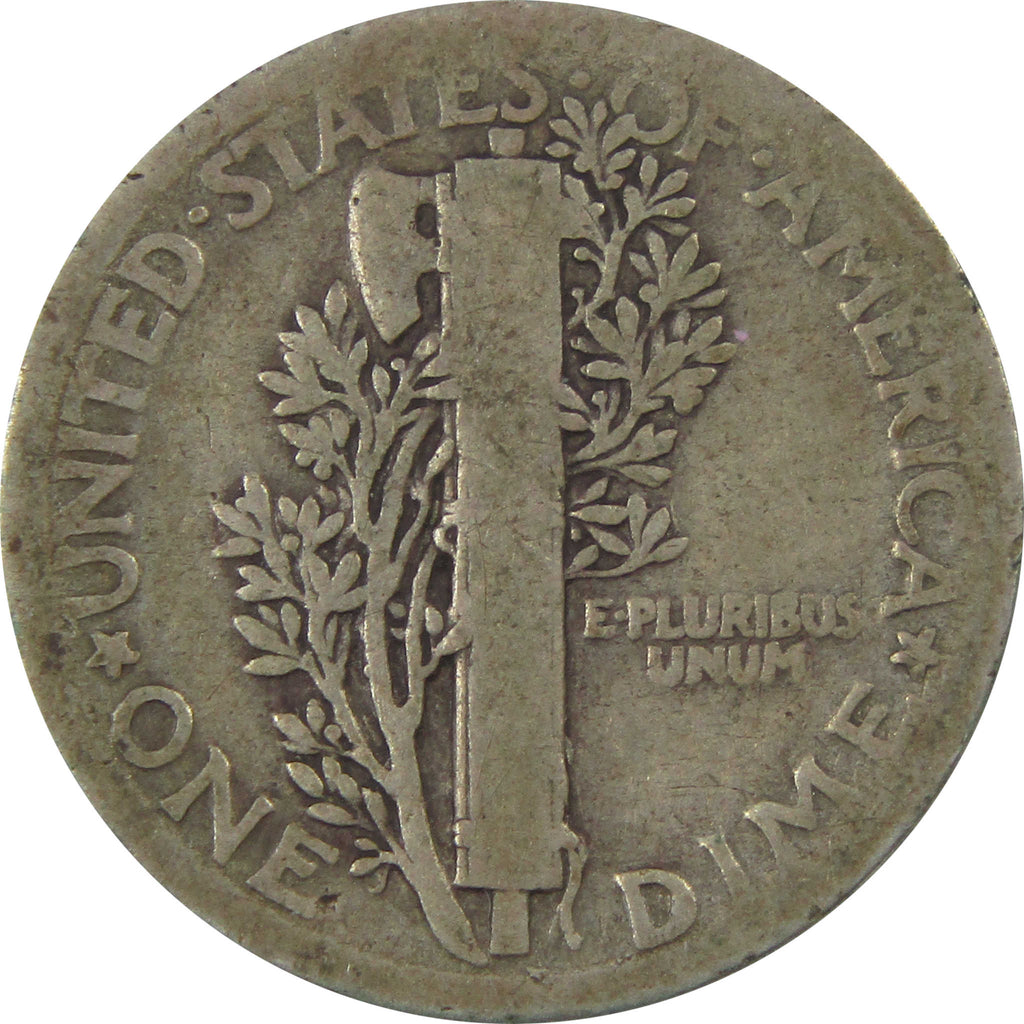 This 90% silver Mercury dime was designed by A.A. Weinman, who also created the Liberty Walking half dollars of 1916-1947. Its obverse features Liberty in a winged cap to symbolize freedom of thought. The reverse depicts a fasces against a branch in the background.