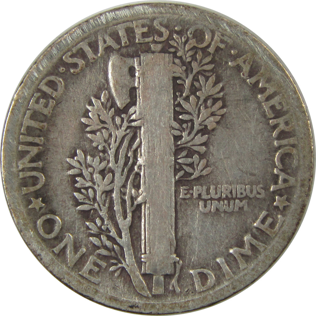 This 90% silver Mercury dime was designed by A.A. Weinman, who also created the Liberty Walking half dollars of 1916-1947. Its obverse features Liberty in a winged cap to symbolize freedom of thought. The reverse depicts a fasces against a branch in the background.