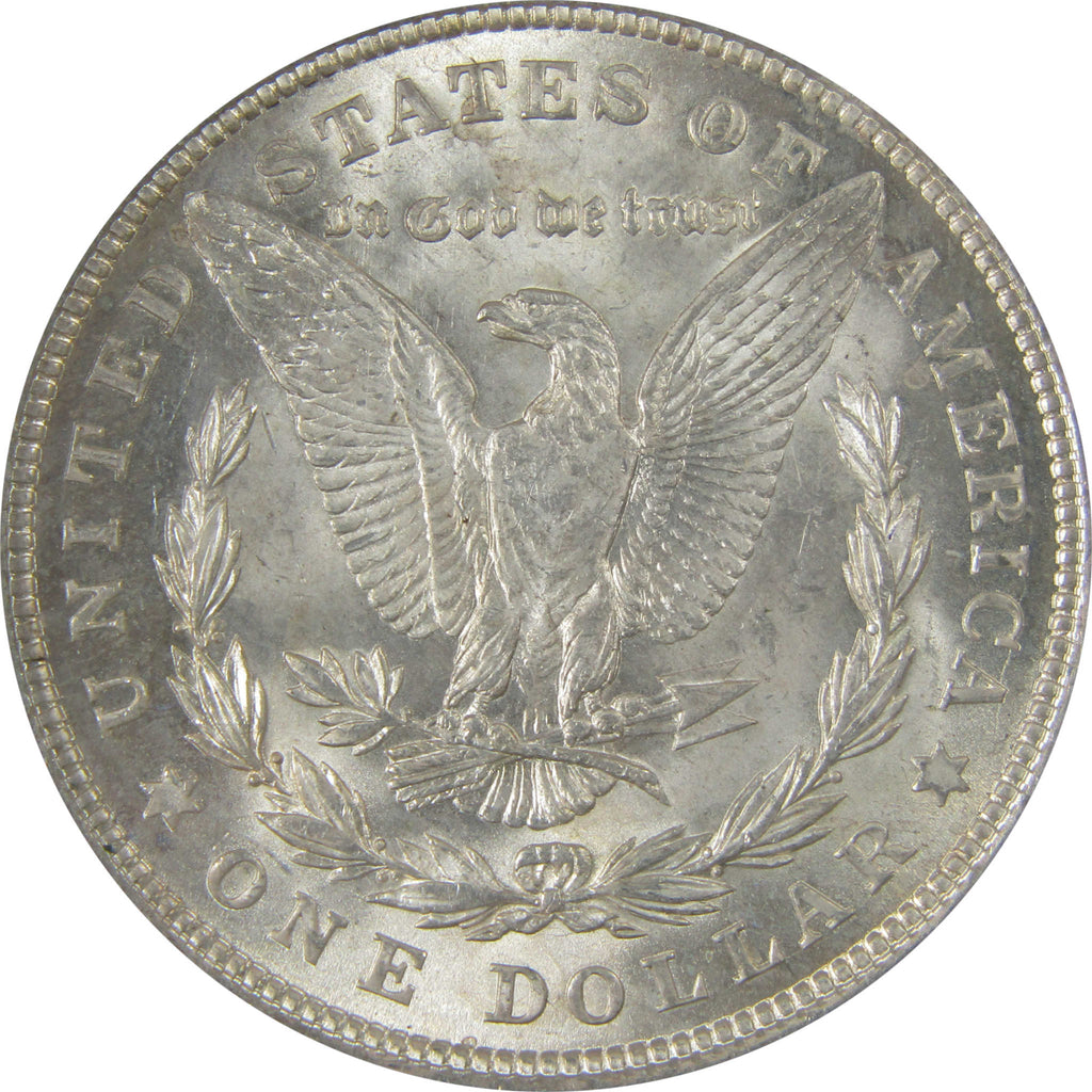 This large 90% silver Morgan dollar bears George T. Morgan's classic depiction of Liberty facing left in a Phrygian cap and a spray of leaves held by a ribbon inscribed LIBERTY. The reverse features an eagle clutching a branch and three arrows.