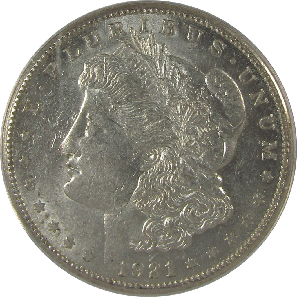 A genuine 1921 S Morgan Silver Dollar Coin, graded and certified AU 53 by ANACS. Contains 90% Silver