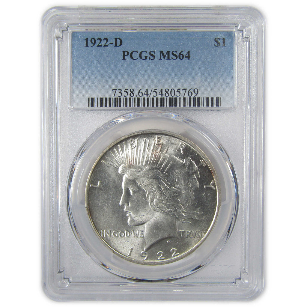 A genuine 1922 D Peace Silver Dollar Coin, graded and certified MS 64 by PCGS. Contains 90% Silver