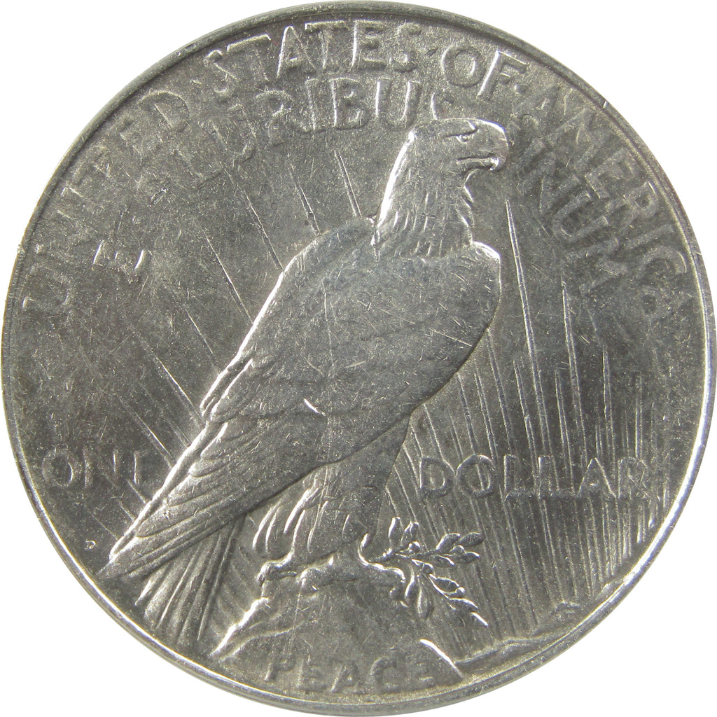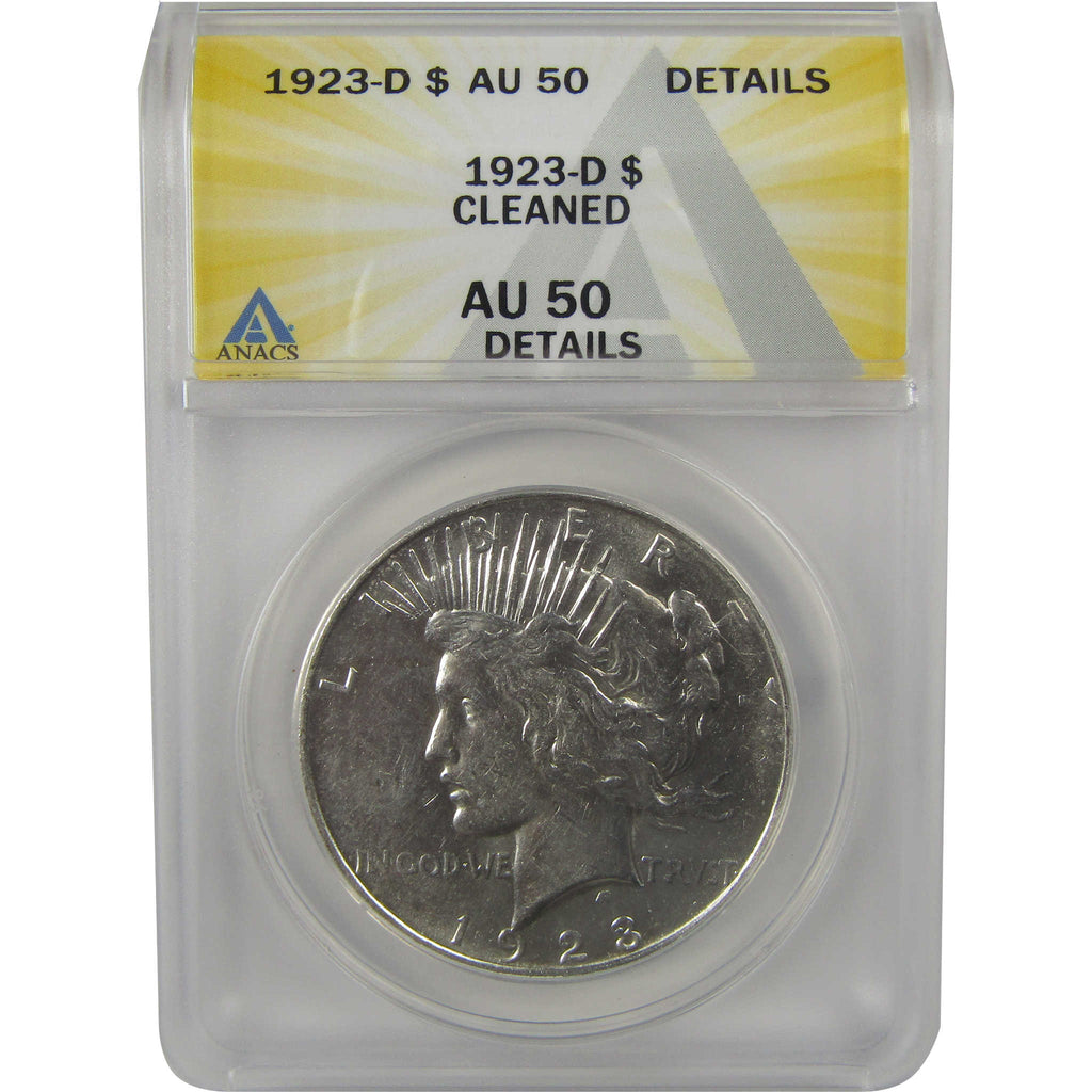 A genuine 1923 D Peace Silver Dollar Coin, graded and certified AU 50 Details by ANACS. Contains 90% Silver. Cleaned