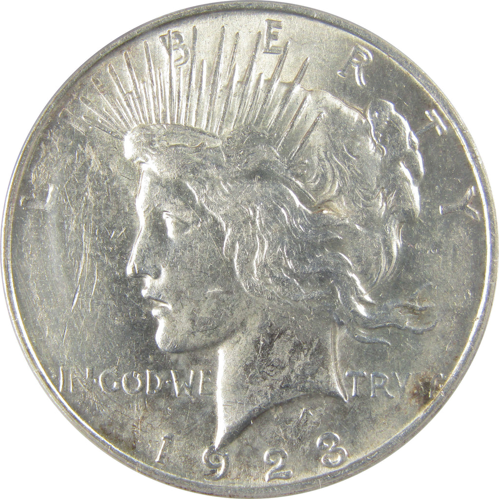 A genuine 1923 D Peace Silver Dollar Coin, graded and certified AU 55 by ANACS. Contains 90% Silver