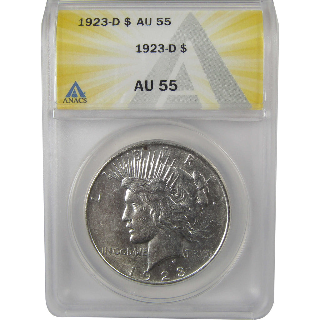 A genuine 1923 D Peace Silver Dollar Coin, graded and certified AU 55 by ANACS. Contains 90% Silver