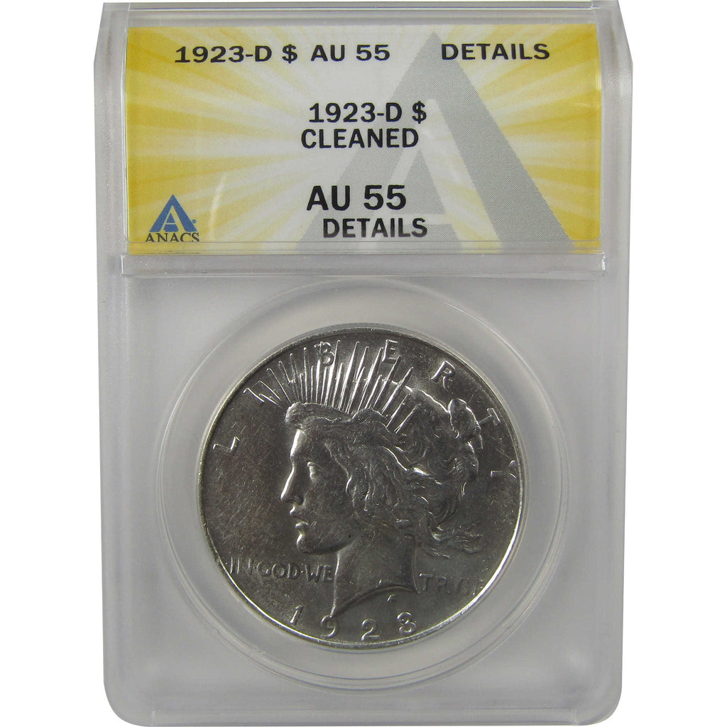 A genuine 1923 D Peace Silver Dollar Coin, graded and certified AU 55 Details by ANACS. Contains 90% Silver. Cleaned