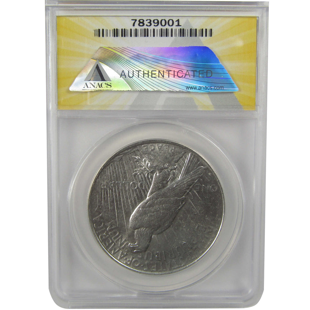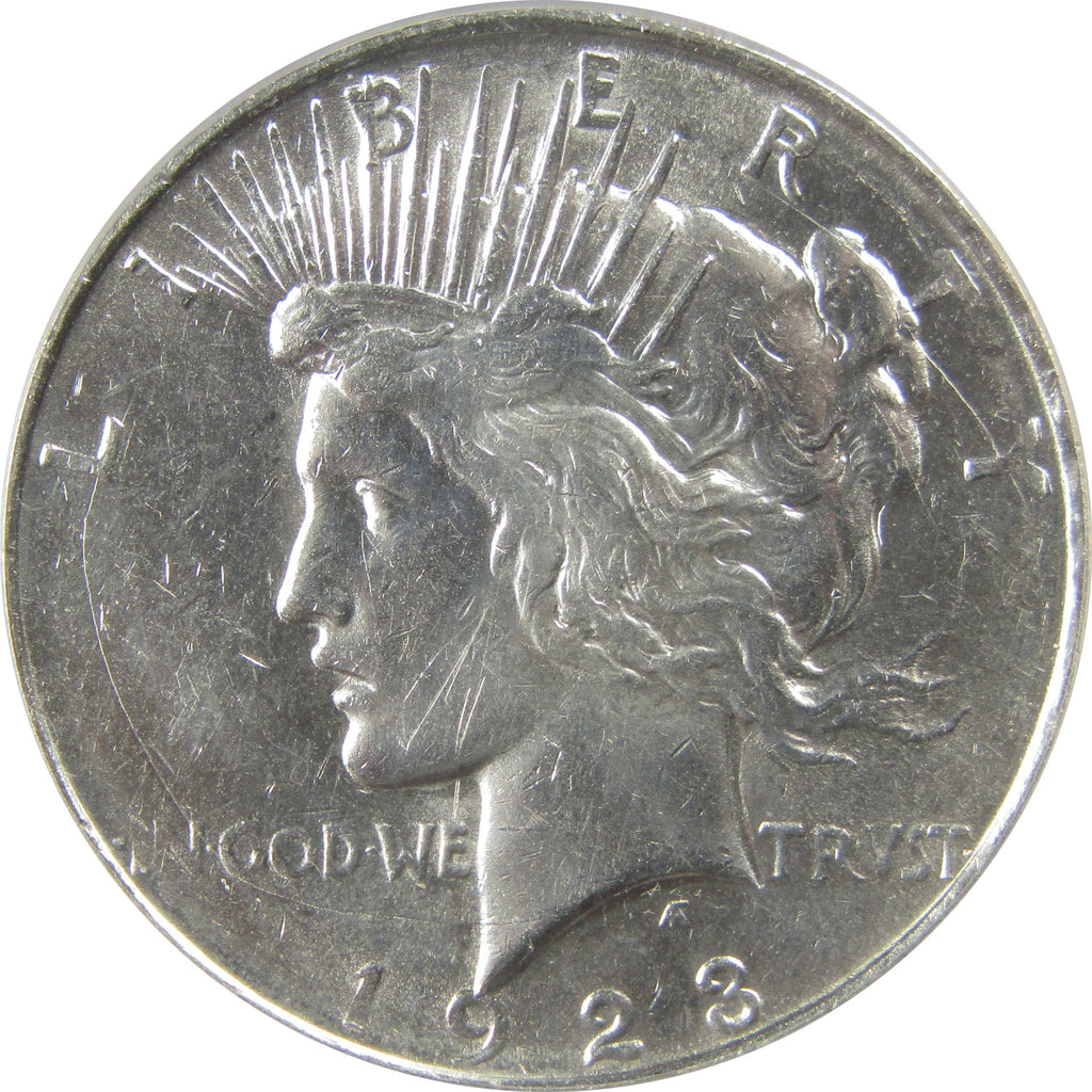 A genuine 1923 D Peace Silver Dollar Coin, graded and certified AU 58 Details by ANACS. Contains 90% Silver. Scratched, Cleaned