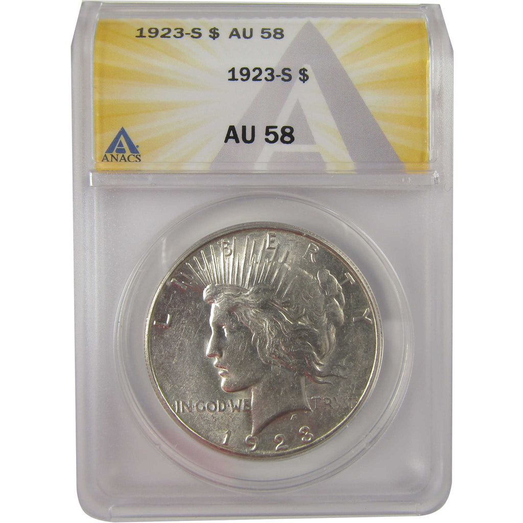 A genuine 1923 S Peace Silver Dollar Coin, graded and certified AU 58 by ANACS. Contains 90% Silver