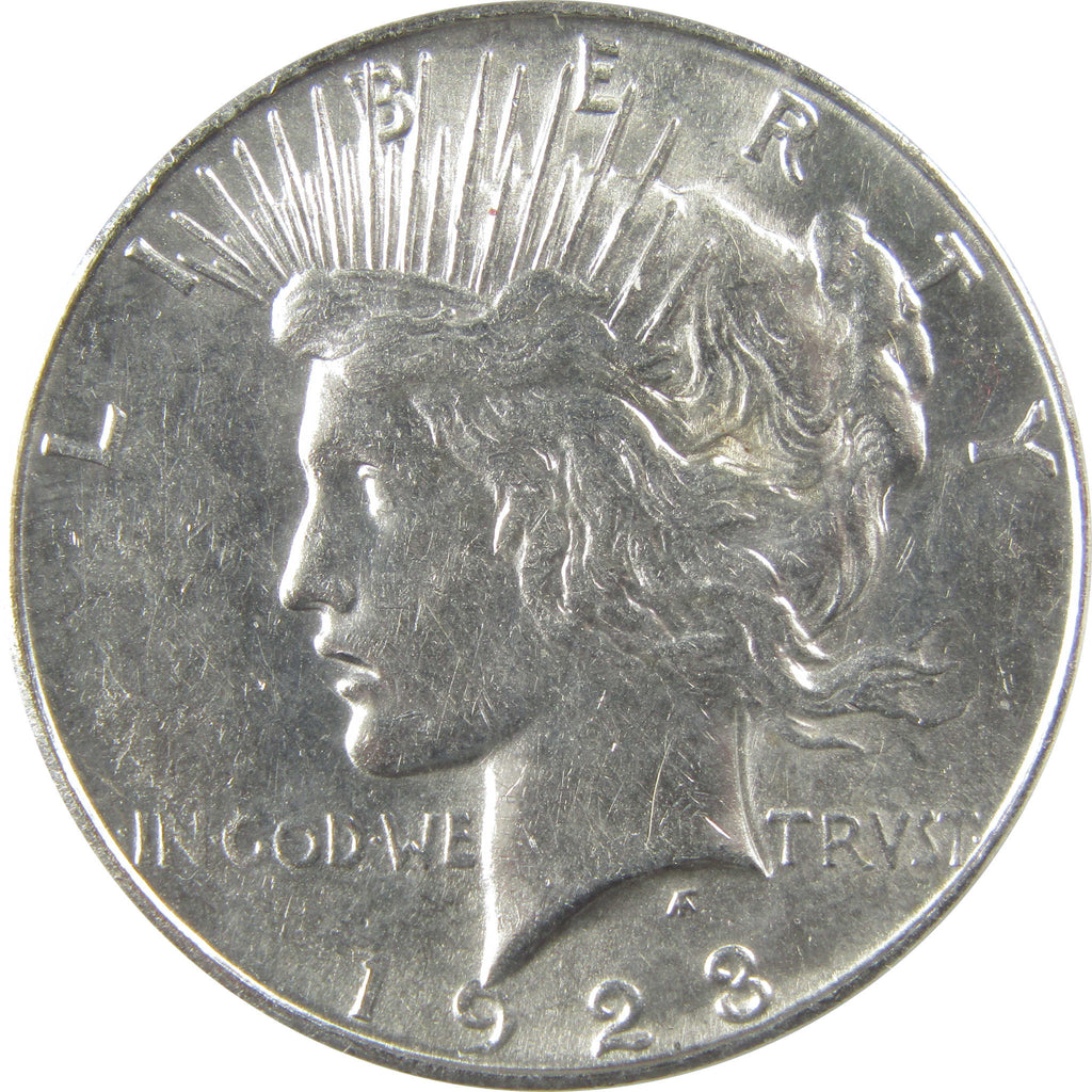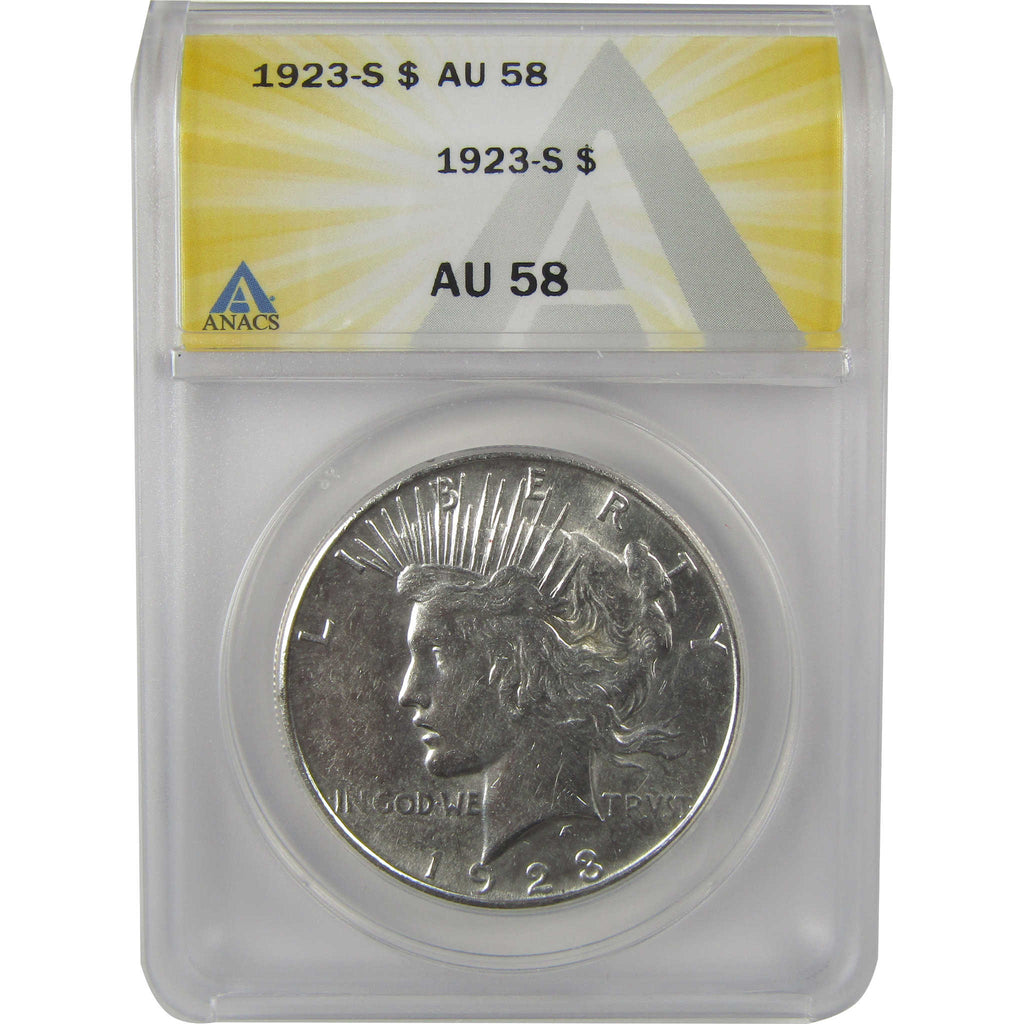 A genuine 1923 S Peace Silver Dollar Coin, graded and certified AU 58 by ANACS. Contains 90% Silver