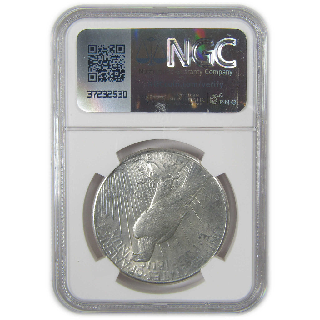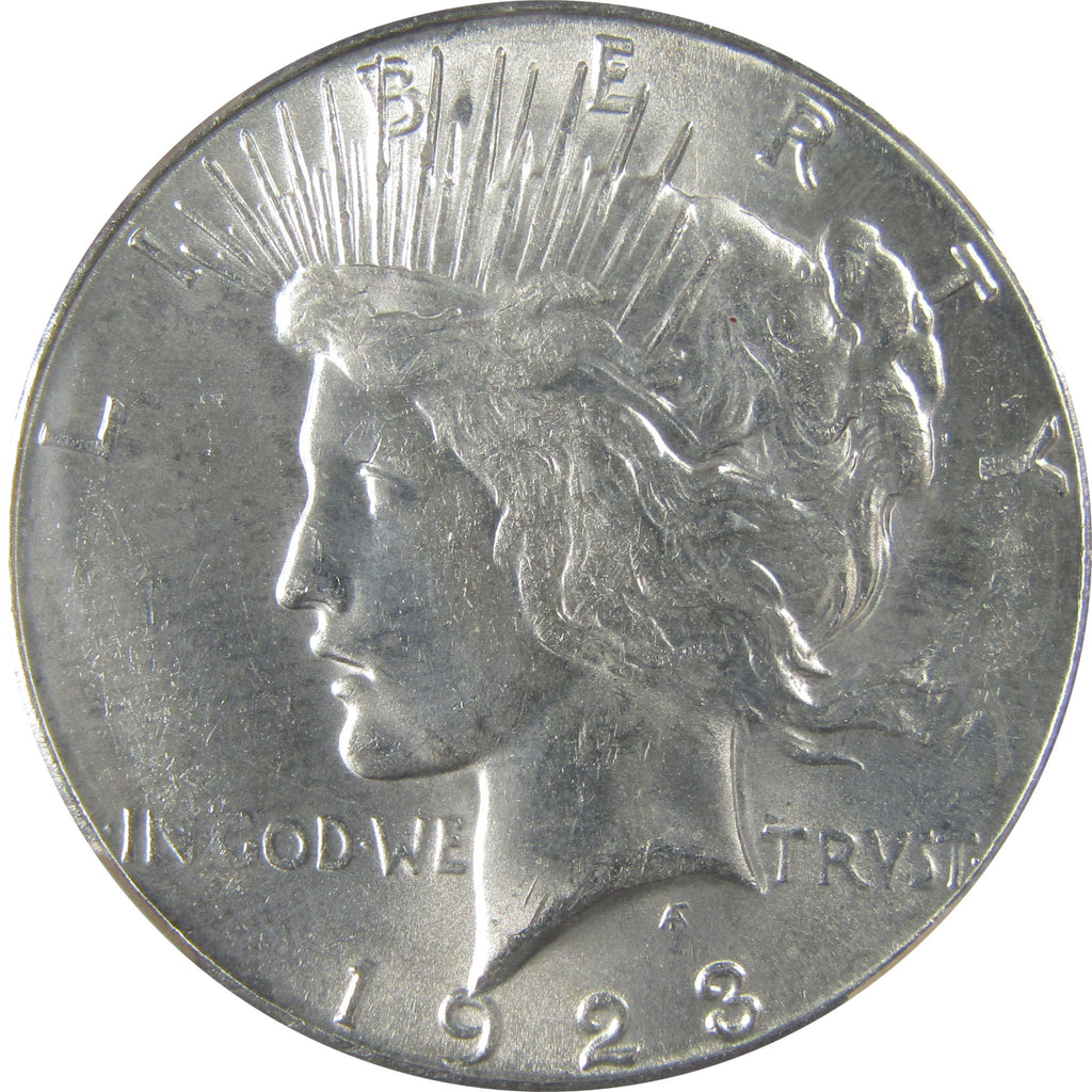 A genuine 1923 S Peace Silver Dollar Coin, graded and certified MS 63 by NGC. Contains 90% Silver. Comes with a fragment of an original vintage canvas bag embedded in the label