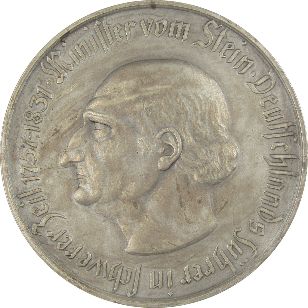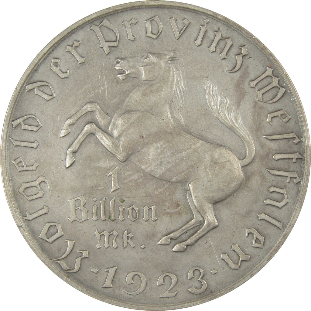 A genuine 1923 Westphalia 1 Trillion Marks coin, in VF Very Fine Condition. This large, nickel-brass coin is 60 mm in diameter, weighs 83.9 grams, and shows a bust of Baron vom Stein on the reverse. Notgeld of the Province Westphalia, this "emergency money" or "necessity money" was issued during the hyperinflation crisis of the Weimar Republic in 1923 following World War I. The lettering on the coin shows "1 Billion Marks", which in German means 1,000,000,000,000 or 1 Trillion.