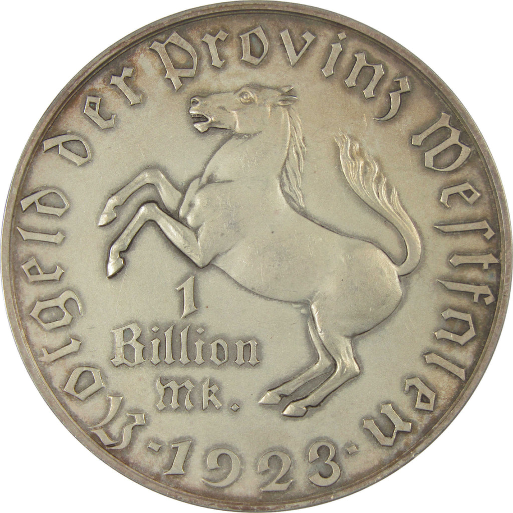 A genuine 1923 Westphalia 1 Trillion Marks coin, in XF EF Extremely Fine Condition. This large, nickel-brass coin is 60 mm in diameter, weighs 83.9 grams, and shows a bust of Baron vom Stein on the reverse. Notgeld of the Province Westphalia, this "emergency money" or "necessity money" was issued during the hyperinflation crisis of the Weimar Republic in 1923 following World War I. The lettering on the coin shows "1 Billion Marks", which in German means 1,000,000,000,000 or 1 Trillion.