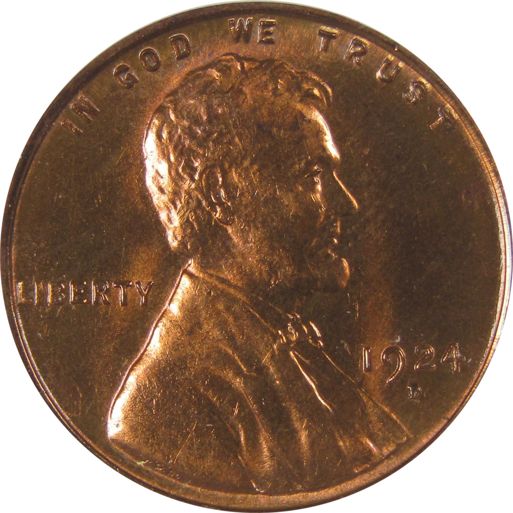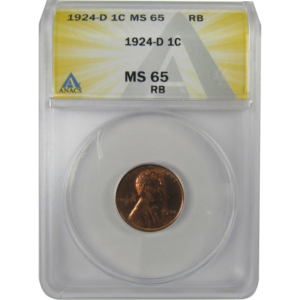 A genuine 1924 D Lincoln Wheat Cent Penny Coin, graded and certified MS 65 RB by ANACS