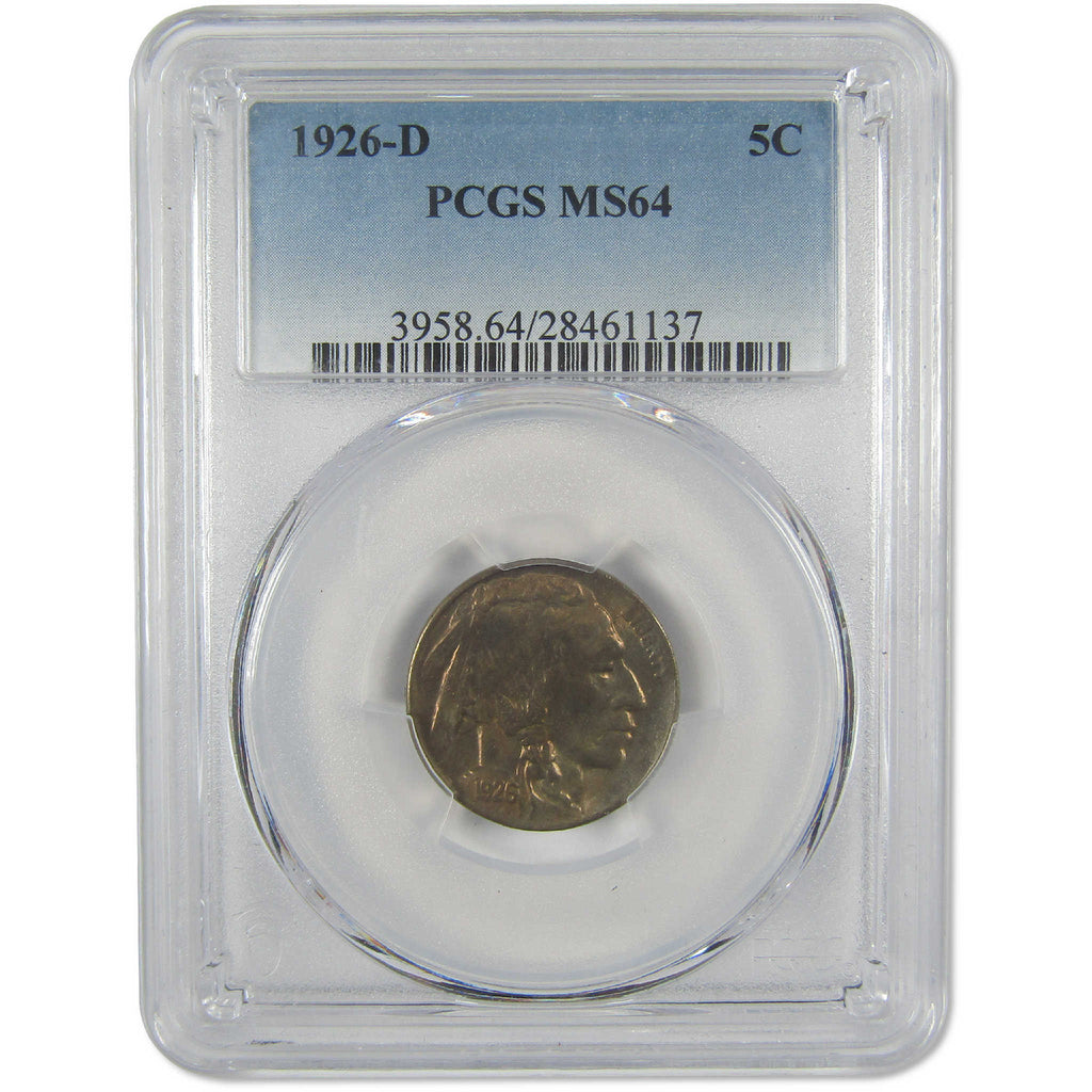 A genuine 1926 D Indian Head Buffalo Nickel Coin, graded and certified MS 64 by PCGS