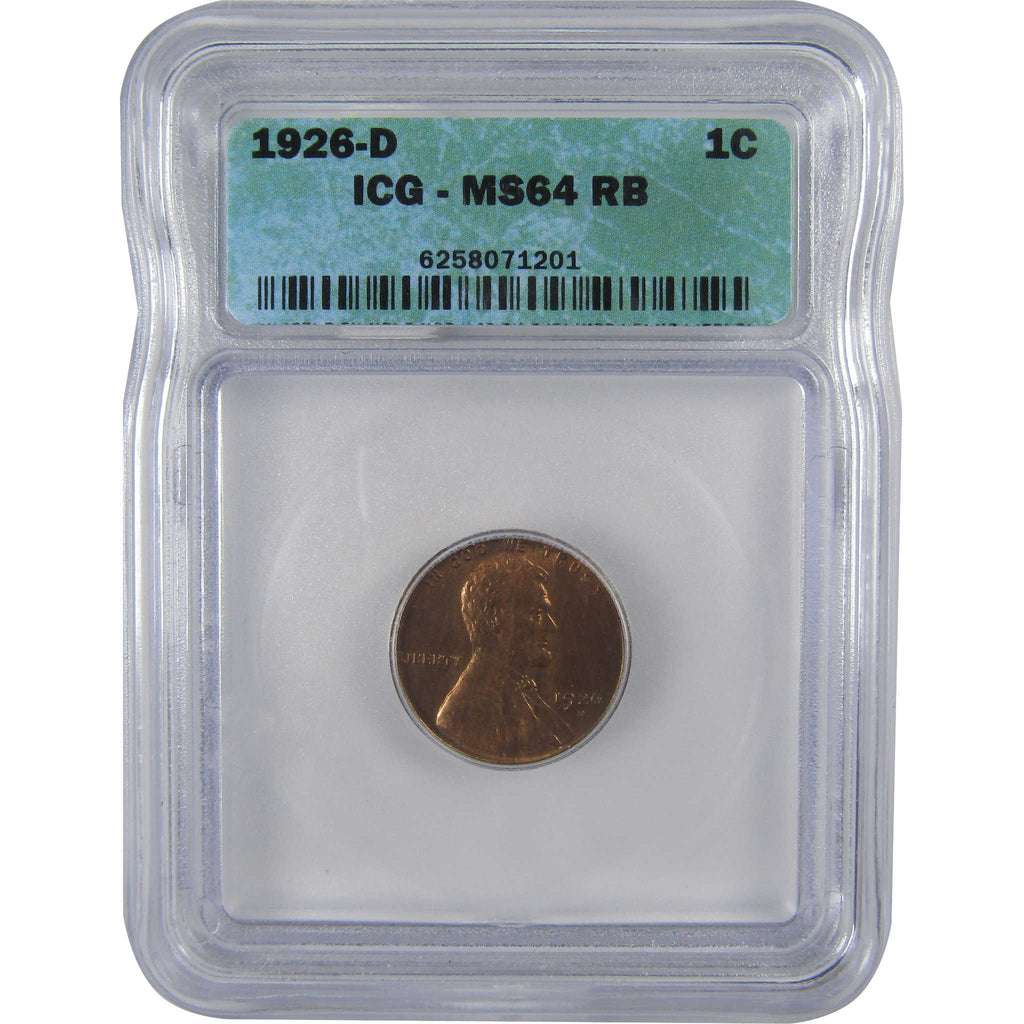 A genuine 1926 D Lincoln Wheat Cent Penny Coin, graded and certified MS 64 RB by ICG
