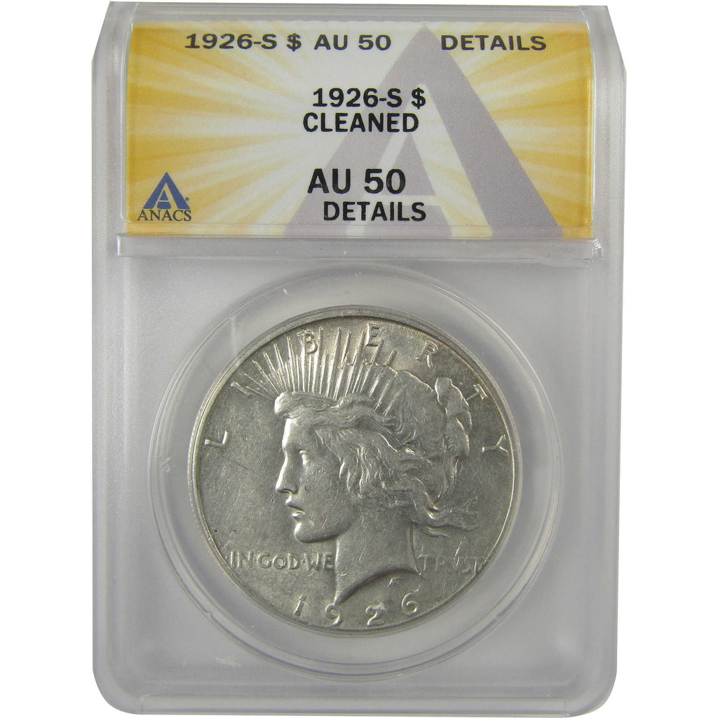 A genuine 1926 S Peace Silver Dollar Coin, graded and certified AU 50 Details by ANACS. Contains 90% Silver. Cleaned