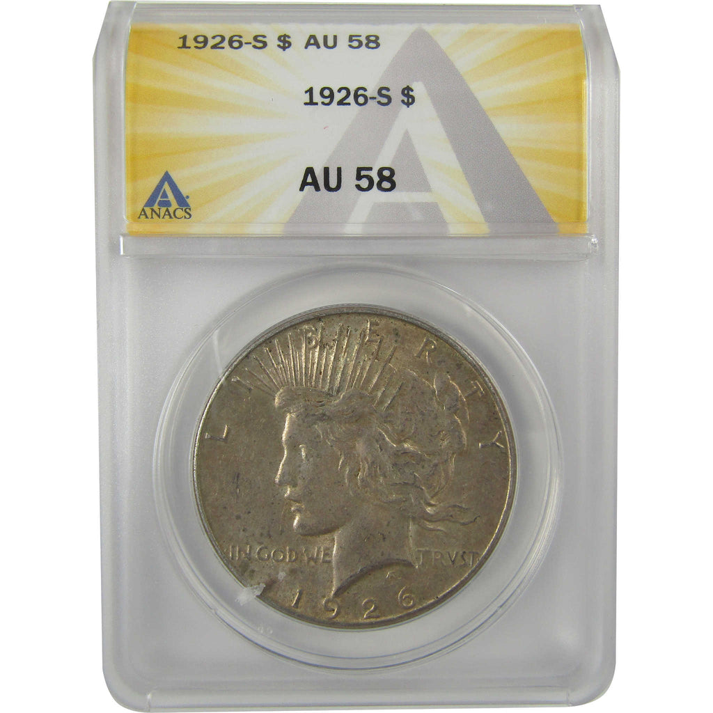 A genuine 1926 S Peace Silver Dollar Coin, graded and certified AU 58 by ANACS. Contains 90% Silver
