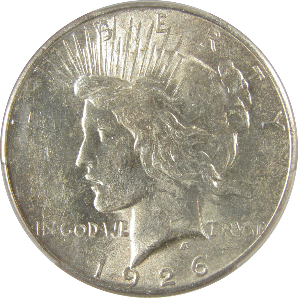 A genuine 1926 S Peace Silver Dollar Coin, graded and certified AU 58 by PCGS. Contains 90% Silver