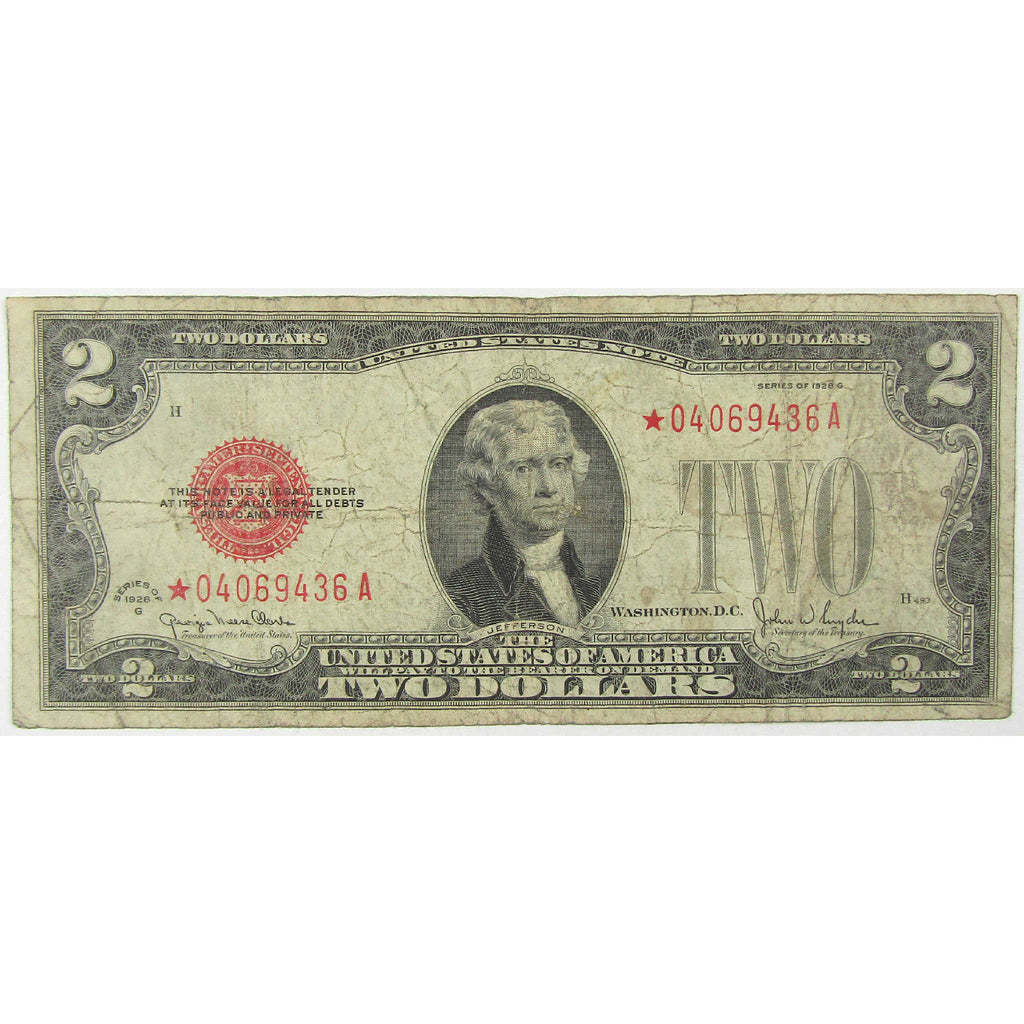 A genuine 1928 G $2 Small Size Legal Tender Star Note, from The Bureau of Engraving & Printing, in VG Very Good Condition.