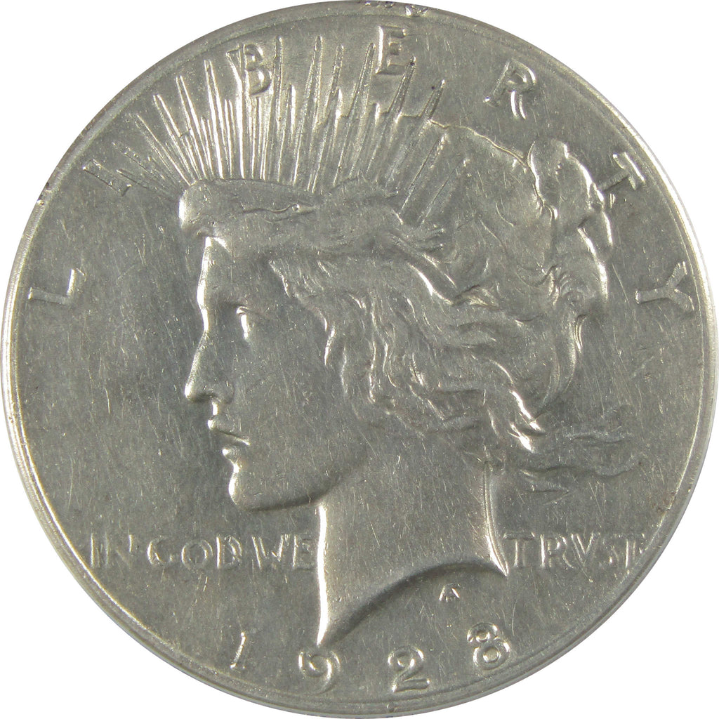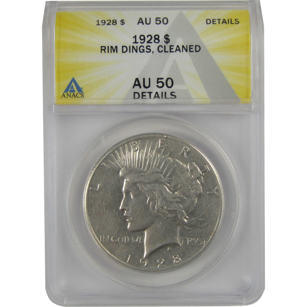 A genuine 1928 Peace Silver Dollar Coin, graded and certified AU 50 Details by ANACS. Contains 90% Silver. Rim Damage, Cleaned