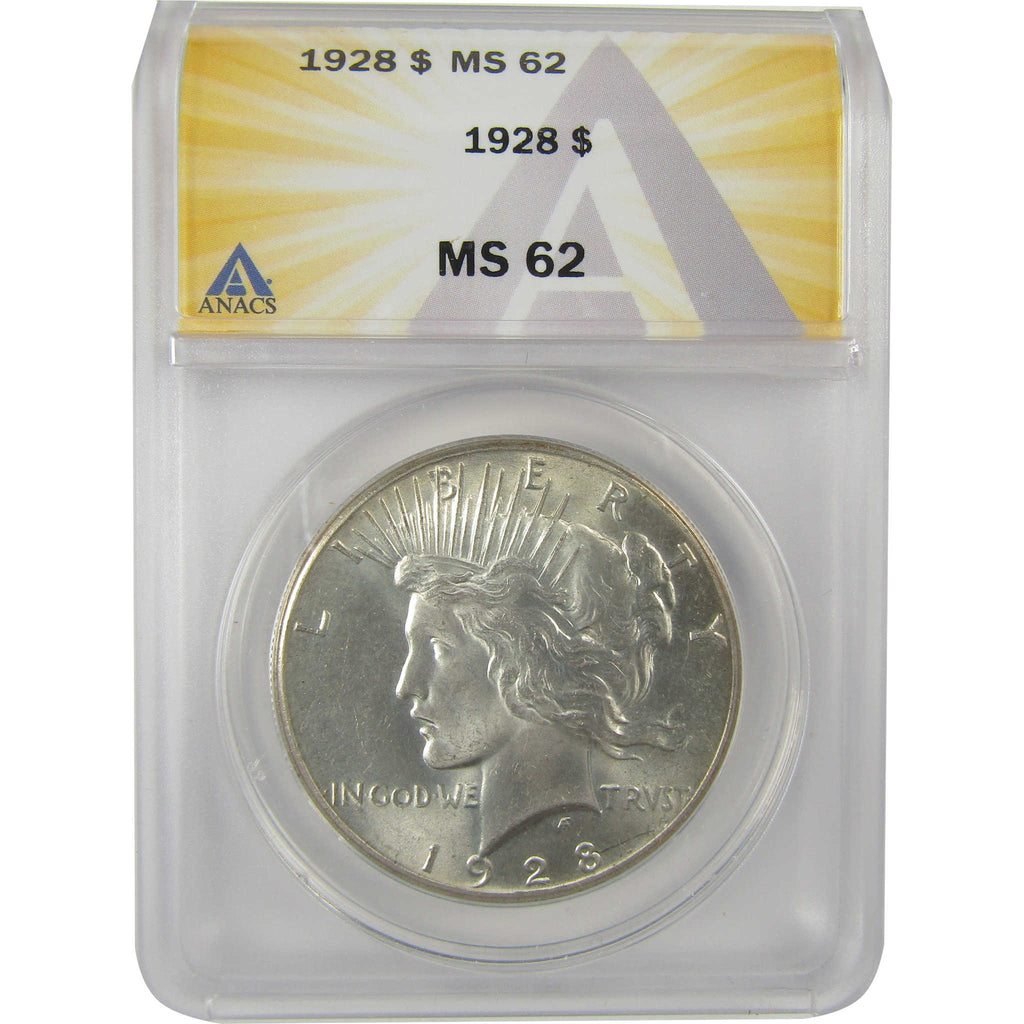 A genuine 1928 Peace Silver Dollar Coin, graded and certified MS 62 by ANACS. Contains 90% Silver