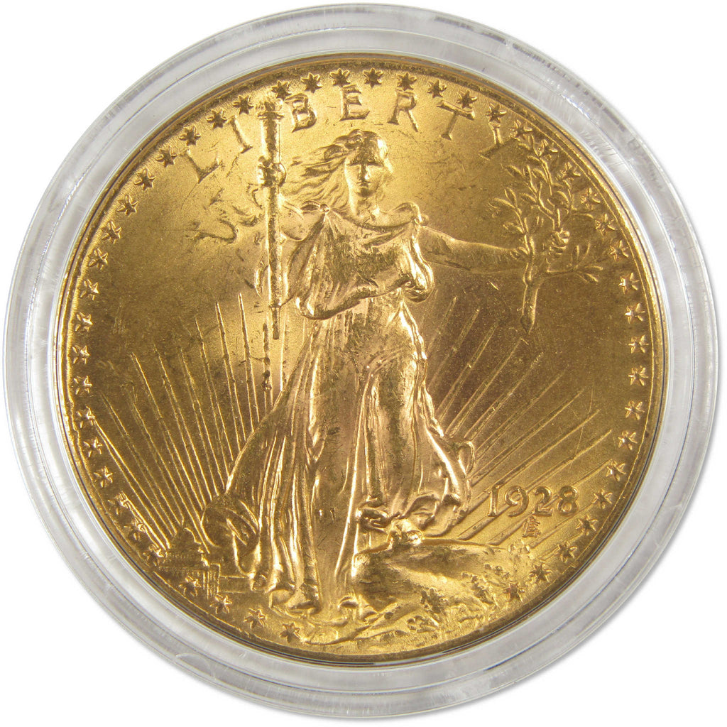 A genuine 1928 $20 Saint-Gaudens Gold Double Eagle Coin, in BU Choice Uncirculated Mint State Condition. Contains 90% Gold