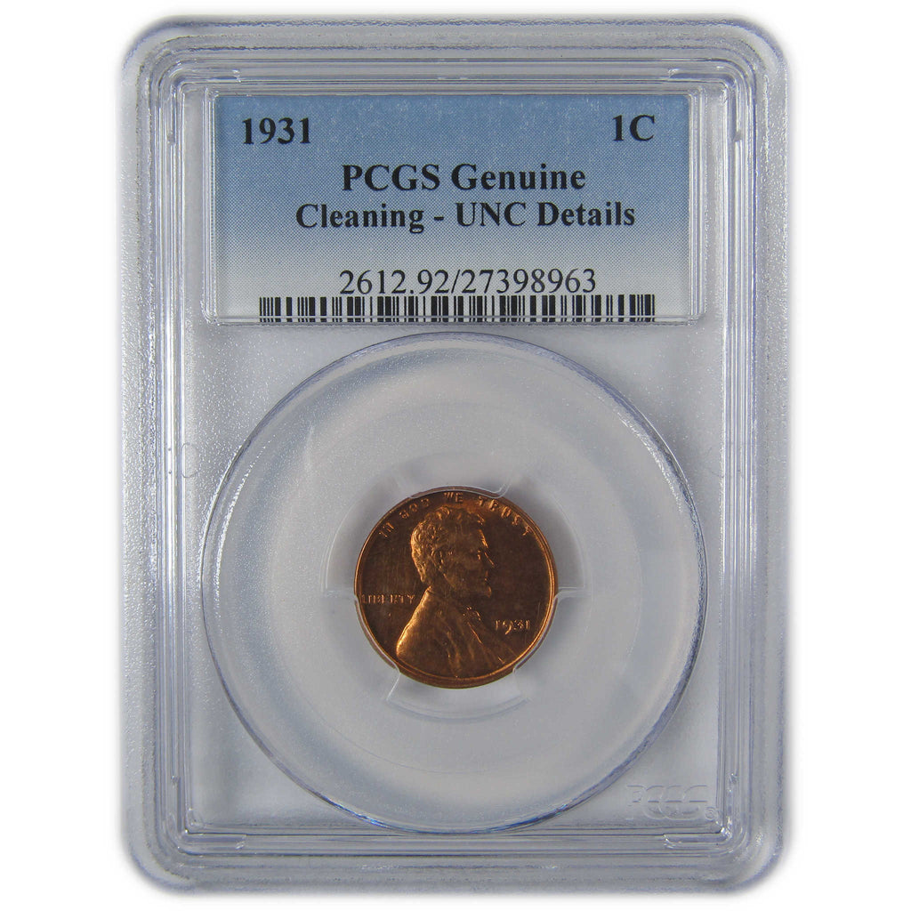 A genuine 1931 Lincoln Wheat Cent Penny Coin, graded and certified Uncirculated Details by PCGS. Cleaned