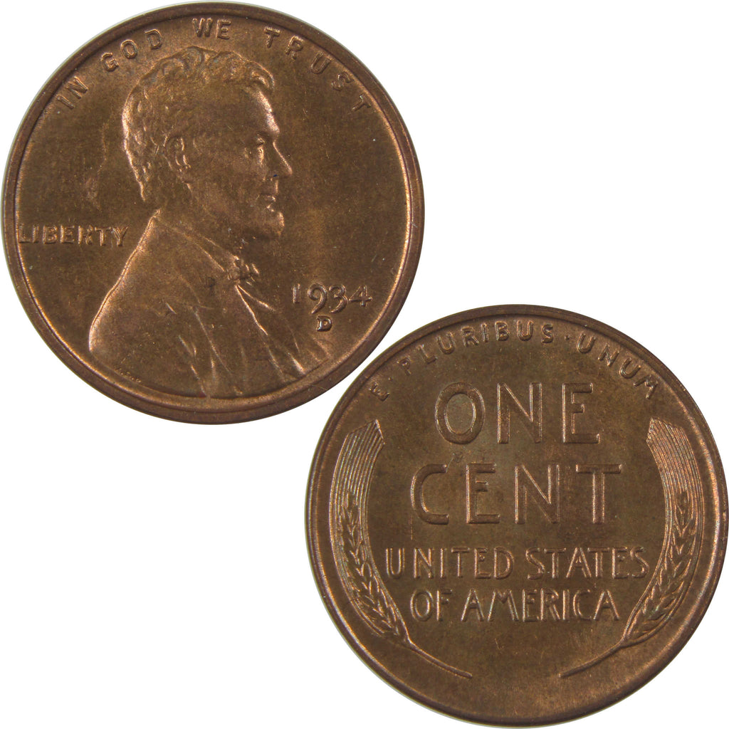 A genuine 1934 D Lincoln Wheat Cent Penny Coin, in Uncirculated Mint State Condition