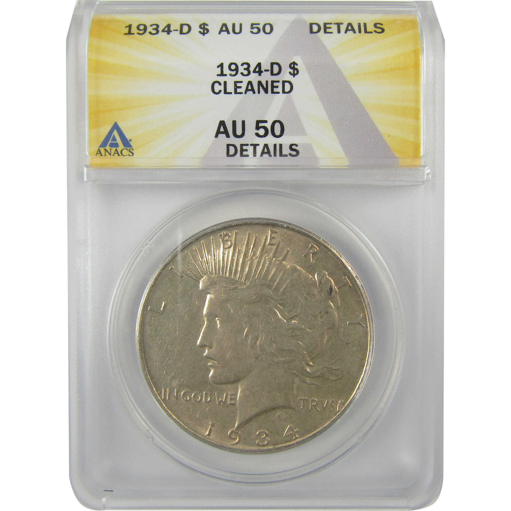 A genuine 1934 D Peace Silver Dollar Coin, graded and certified AU 50 Details by ANACS. Contains 90% Silver. Cleaned
