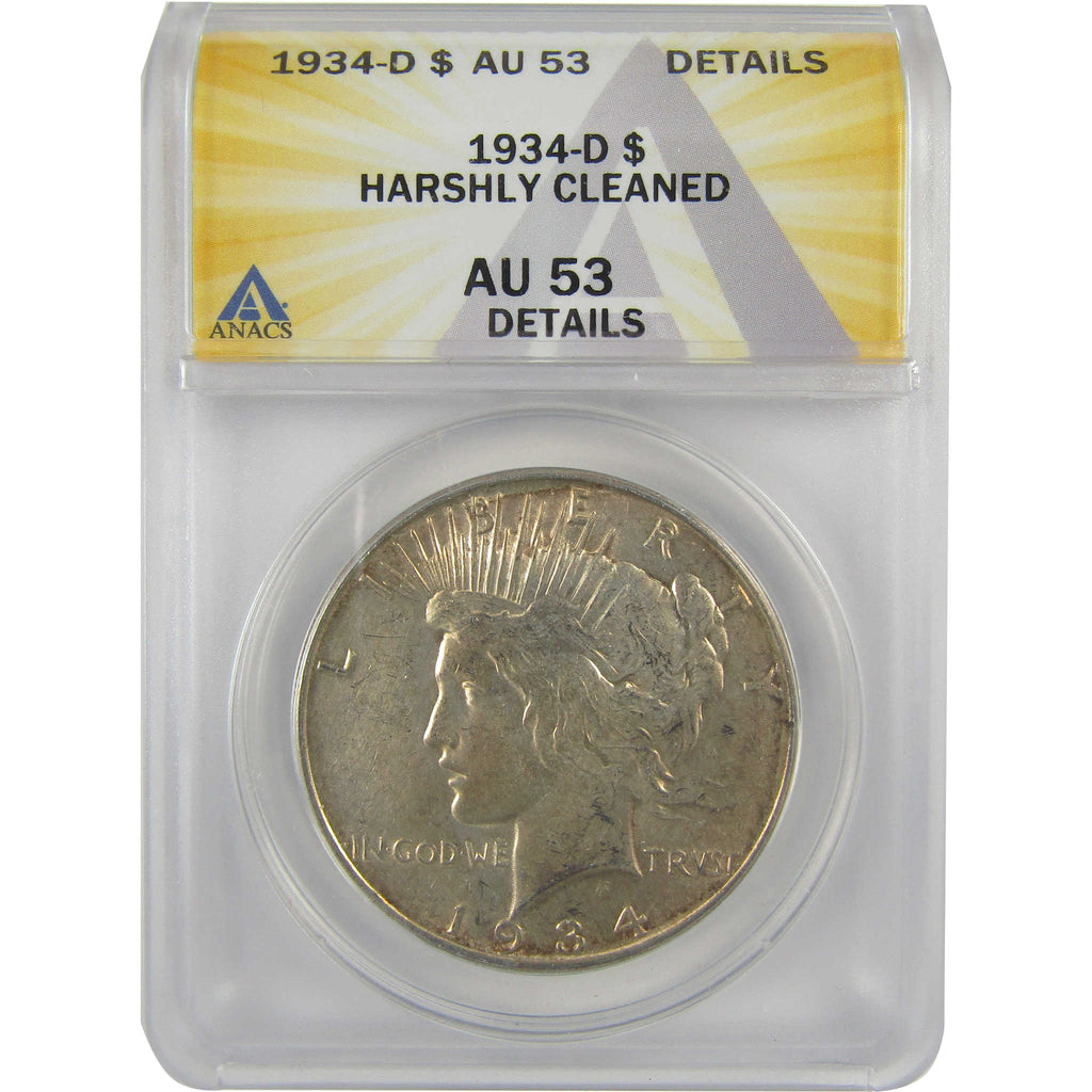 A genuine 1934 D Peace Silver Dollar Coin, graded and certified AU 53 Details by ANACS. Contains 90% Silver. Harshly Cleaned