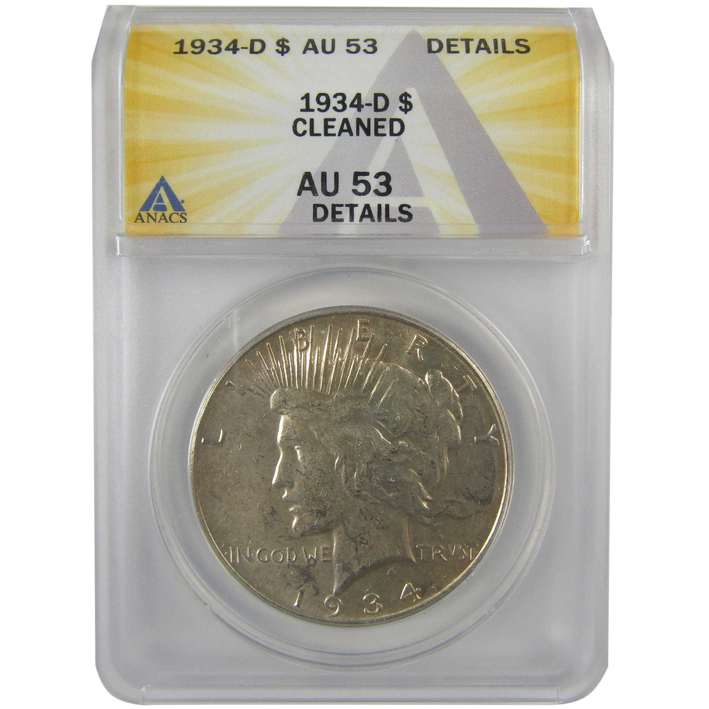 A genuine 1934 D Peace Silver Dollar Coin, graded and certified AU 53 Details by ANACS. Contains 90% Silver. Cleaned