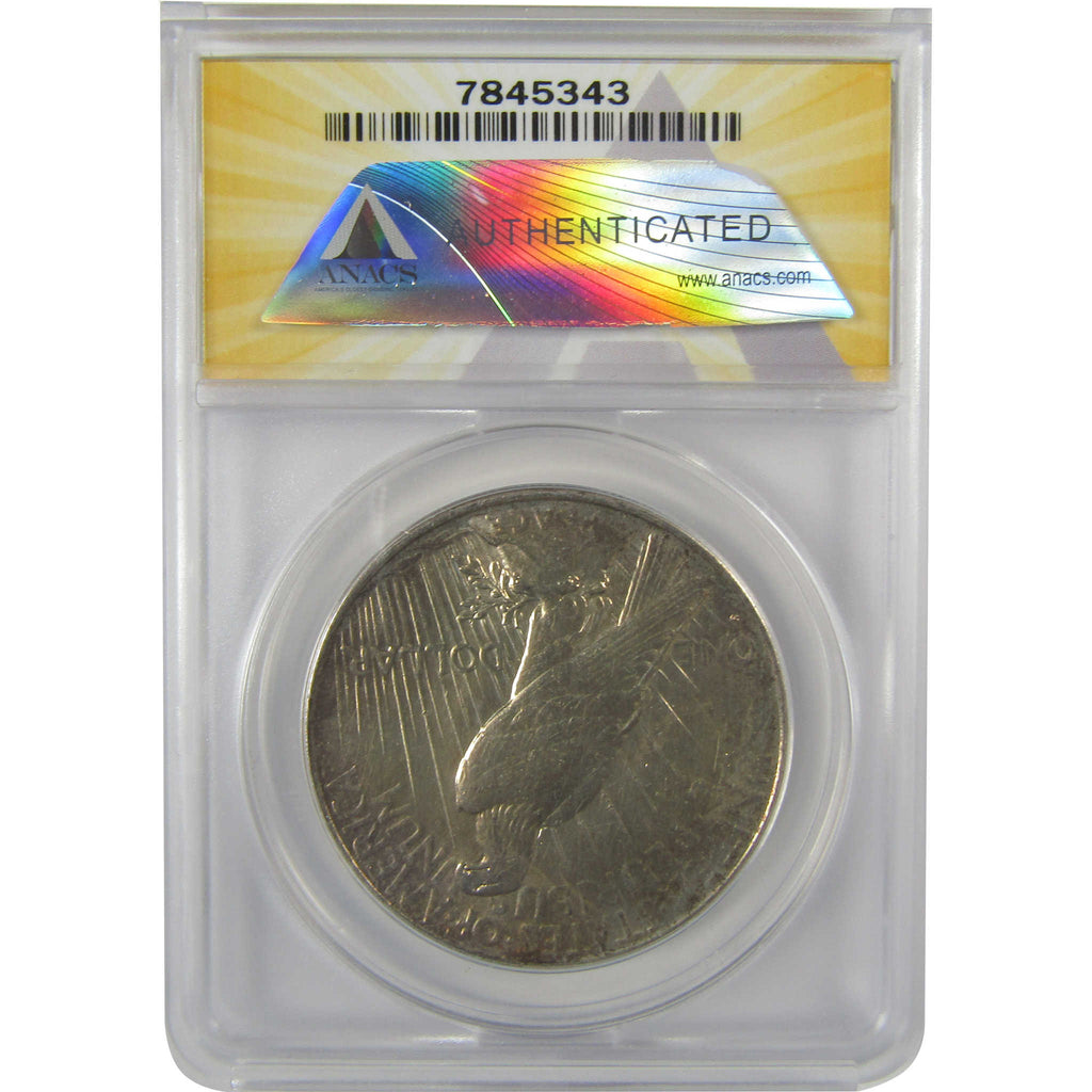 A genuine 1934 D Peace Silver Dollar Coin, graded and certified AU 53 Details by ANACS. Contains 90% Silver. Harshly Cleaned