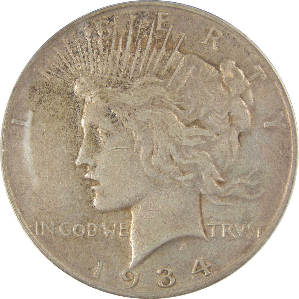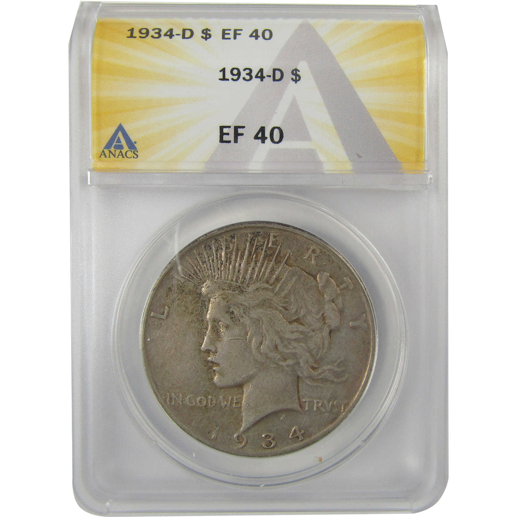 A genuine 1934 D Peace Silver Dollar Coin, graded and certified EF 40 by ANACS. Contains 90% Silver