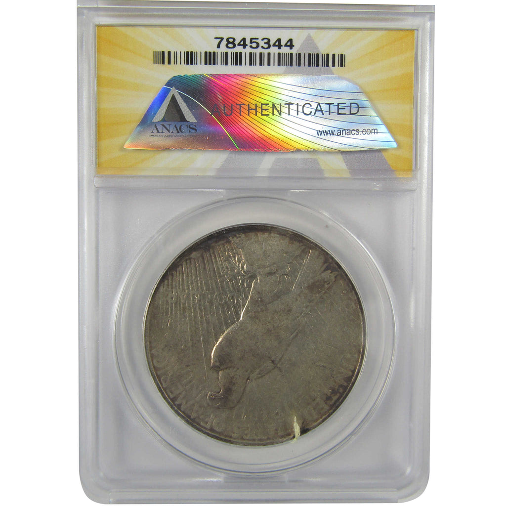 A genuine 1934 D Peace Silver Dollar Coin, graded and certified F 12 Details by ANACS. Contains 90% Silver. Harshly Cleaned