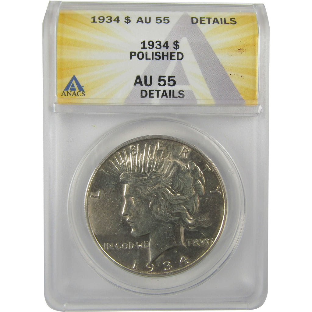 A genuine 1934 Peace Silver Dollar Coin, graded and certified AU 55 Details by ANACS. Contains 90% Silver. Polished