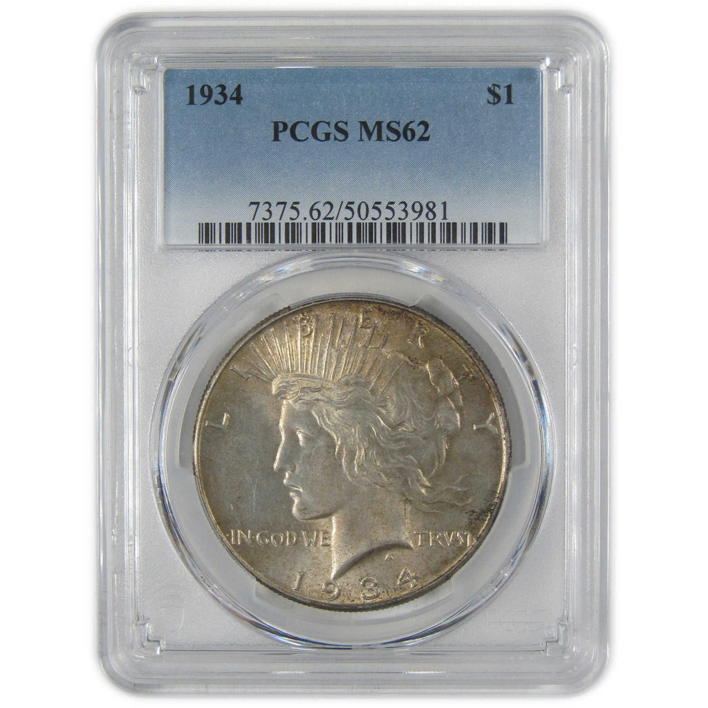 A genuine 1934 Peace Silver Dollar Coin, graded and certified MS 62 by PCGS. Contains 90% Silver